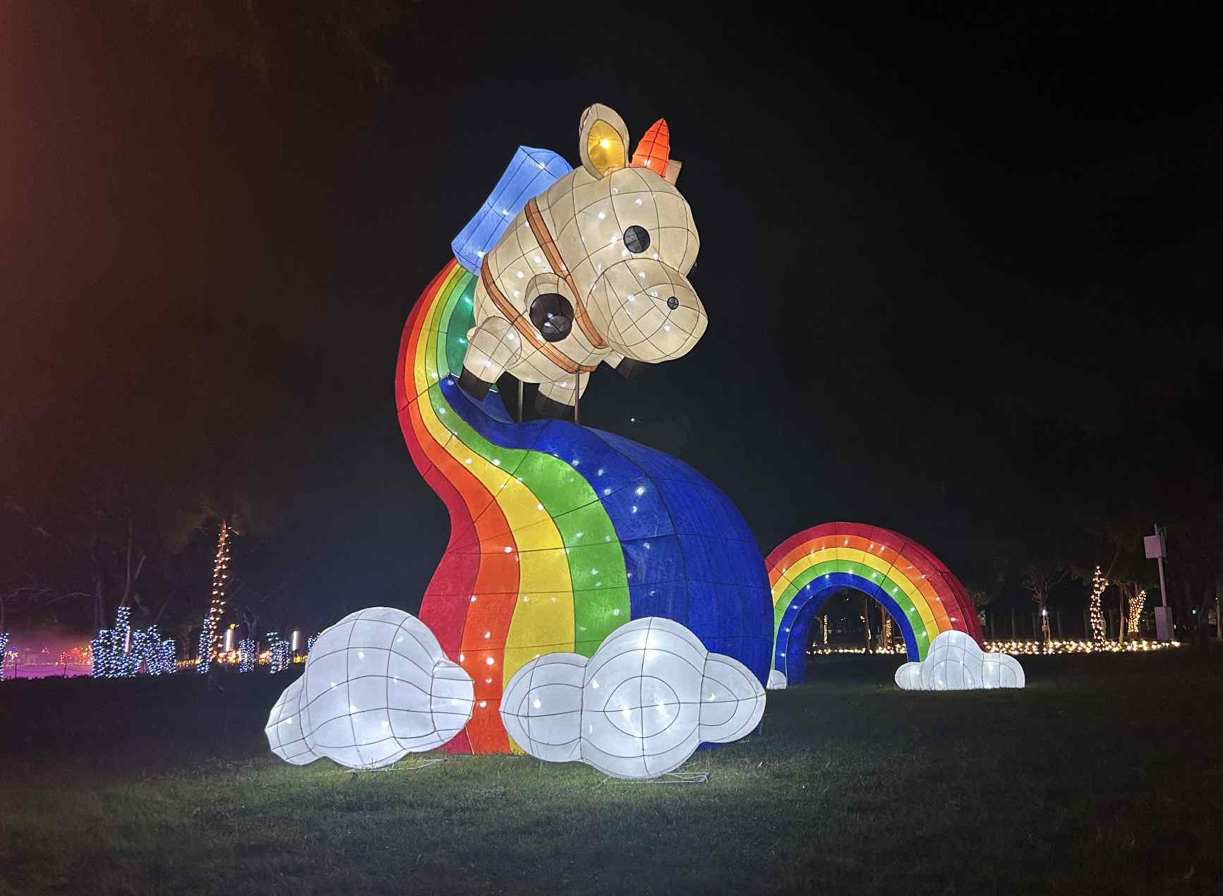 農業局表示,「動物夢世界」燈區規劃許多巨型奇幻風格燈景,值得市民朋友們親身體驗,從古埃及女神巴斯特開啟夢境通道,到「消逝之塔」提醒著快要消失在這世界的動物們;「貓眼凝視」巨大黑貓凝視著人們如何對待動物;「星際救援」來自火星的狗狗來福從飛碟降落;「地下密會」地面冒出鼴鼠與穿山甲;「菇菌密林」巨大的菇勇者展示有機耕作的成果,「星幕共伴」仰望璀璨星空;「希望迴環」神秘又溫柔的庇護所;「希望彩虹谷」飛天小馬在彩虹溜滑梯上遊玩;「幻蝶瀑布」蝶影紛飛的光瀑,最後抵達旅程的終點「擁抱明日」,相信只要願意守護,明天就會更好。
