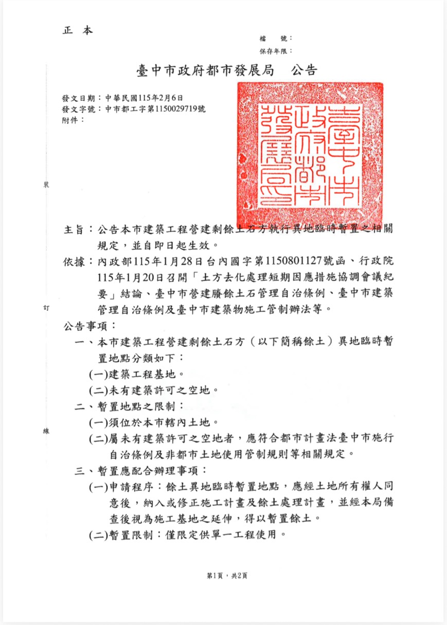 為因應台中市建築工程施工期間營建剩餘土石方暫置需求,及舒緩土資場後端去化困難壓力,並建立明確且可管控的管理制度,台中市政府都市發展局公告建築工程營建剩餘土石方異地臨時暫置相關規定,並自即日起實施。