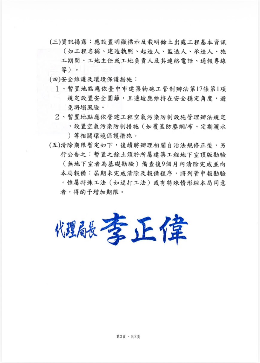 都發局長李正偉強調,此次公告前提為兼顧工程彈性與管理秩序,建立制度化、可追溯的營建餘土暫置機制,透過事前報備、施工管理及期限管制,持續強化台中市營建剩餘土石方管理,確保公共安全與環境品質。