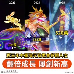 觀旅局補充說明,2026中台灣燈會自2月15日(小年夜)至3月3日(元宵節)展出,期間僅除夕休展,集結市府5個機關共同策劃7大主題展區,包括以姆明故事情境打造的「極光下的姆明谷」、「河畔奇航」、「露營時光」,以及建設局「驚蟄界」、教育局「童趣歡樂谷」、民政局「幸福祈願村」、農業局「動物夢世界」等特色燈區,無論是想拍照打卡、感受童話氛圍,或欣賞傳統花燈藝術,都能一次滿足。