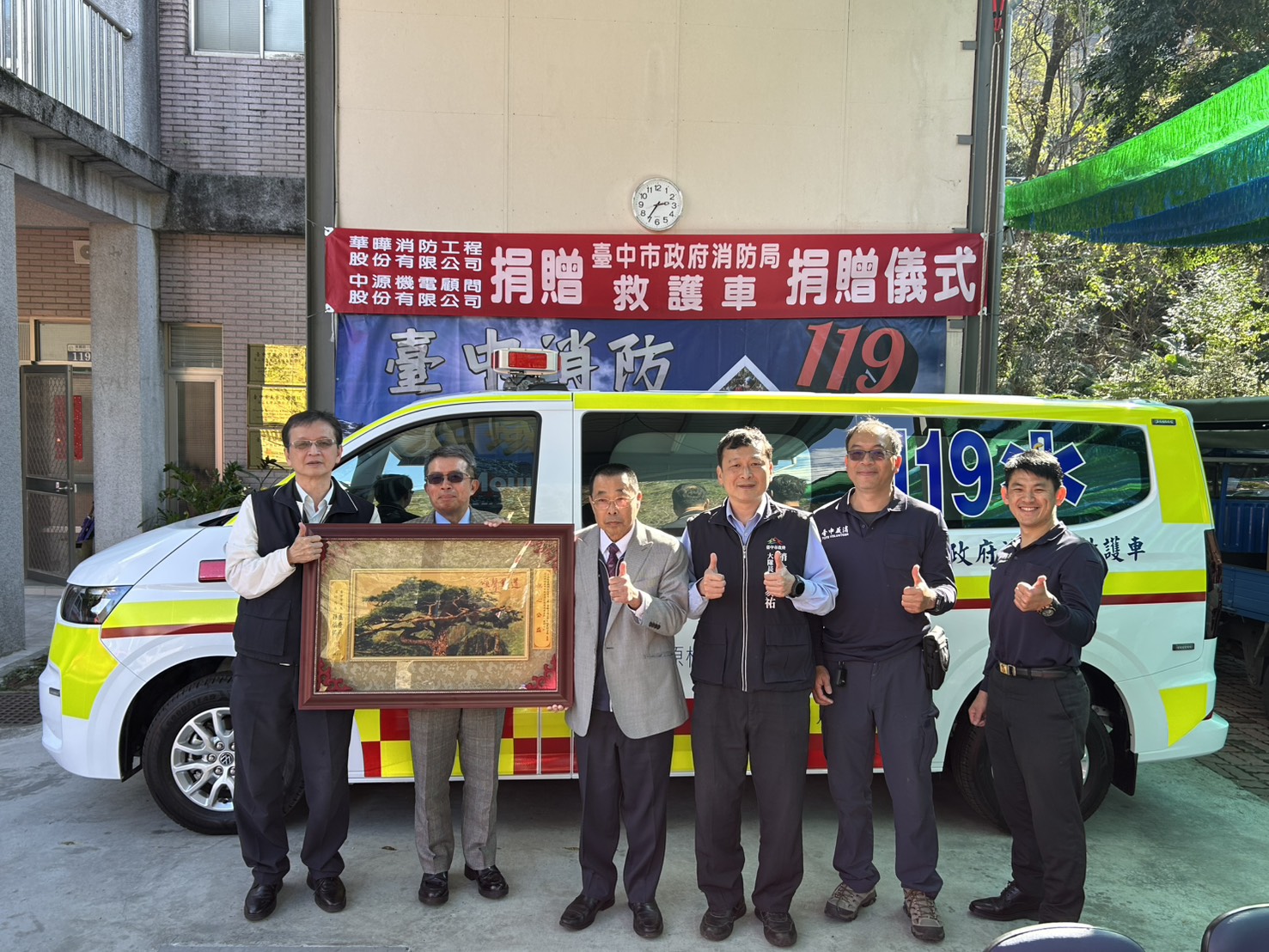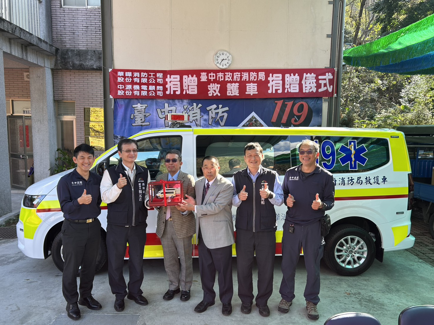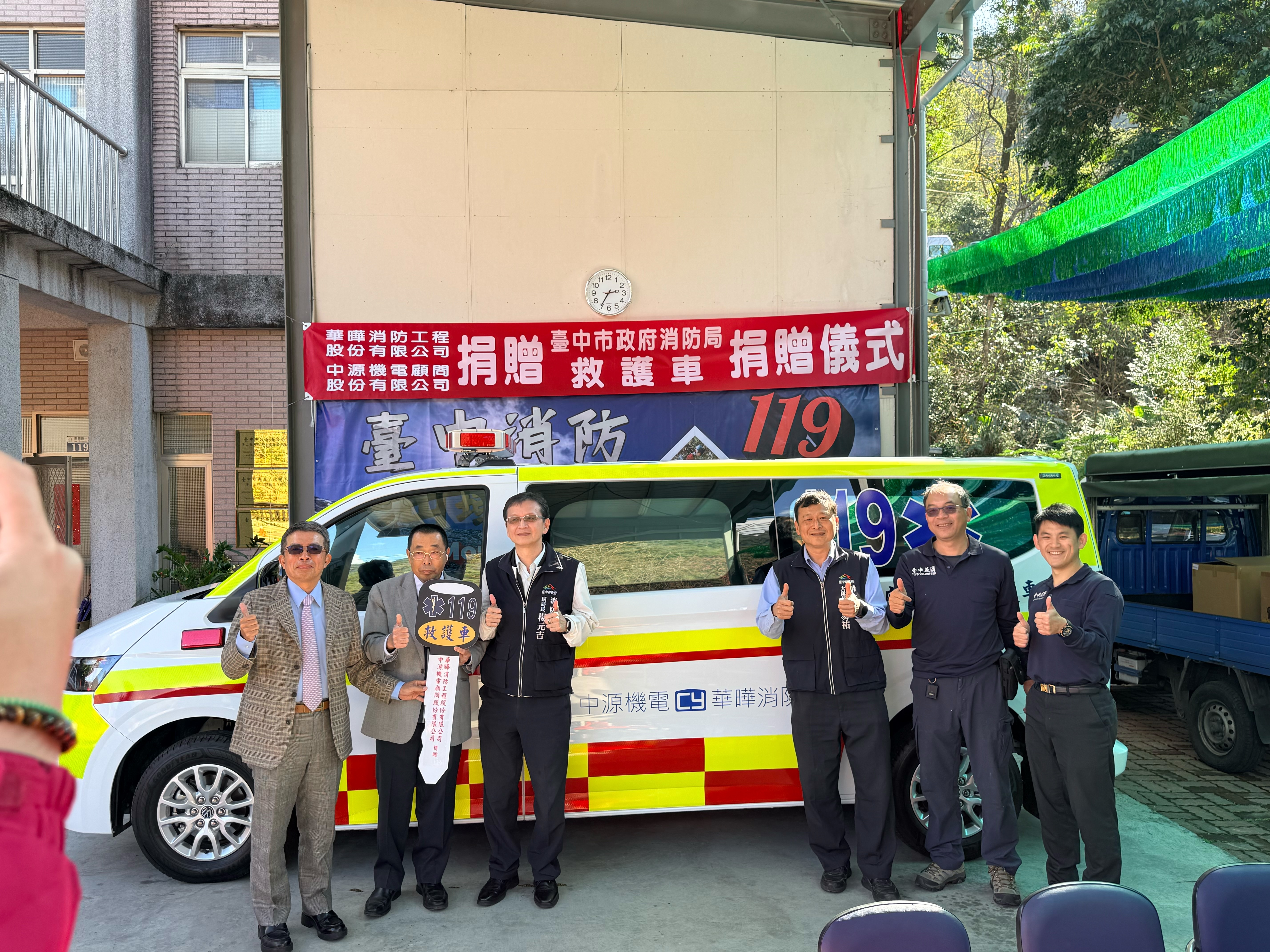 為強化台中市緊急救護量能、提升市民生命安全保障,華曄消防工程股份有限公司秉持回饋社會、守護生命的公益精神,攜手中源機電顧問股份有限公司,慷慨捐贈市府消防局谷關分隊一輛全新高規格救護車,為第一線緊急救護戰力注入重要助力。捐贈儀式於昨(7)日在消防局第二救災救護大隊谷關分隊溫馨舉行,由副局長楊元吉代表受贈並致詞感謝,現場氣氛溫馨感人,展現企業關懷公共安全、守護市民健康的善行義舉,也彰顯公私協力共同守護生命的正向力量。