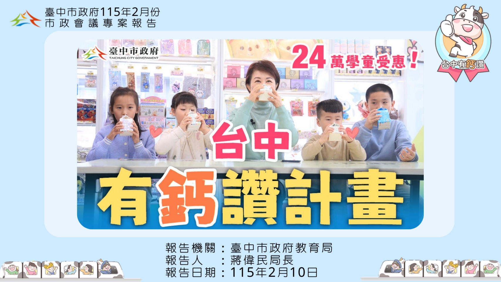 此外,台中市政府同步建置「台中有鈣讚政策網站」,提供最新消息、兌換方式、懶人包及Q&A等資訊,方便家長隨時查詢;政策上線前也辦理三場說明會,說明公立國小及公私立幼兒園操作方式、規範及替代方案。