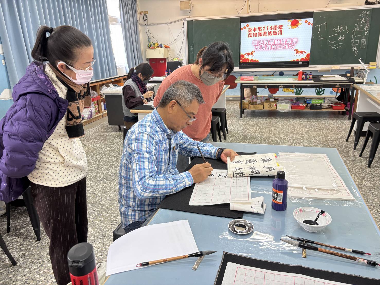 教育局長蔣偉民表示,市長盧秀燕重視美感教育,教育局103年在后里區內埔國小成立「書法教學資源中心」,多年來持續辦理教師書法增能精進研習及書法競賽,透過制度化推動,讓書法種子得以永續傳承。114學年度「書法教學師資專業成長研習」自去年12月啟動,將持續至今(115)年5月,研習場次分別於和平區和平國小、梧棲區大德國小、后里區內埔國小、市立大華國中、太平區太平國小、西區忠明國小及北屯區文心國小等校辦理,規劃共28場次,提供台中市教師精進書法教學專業。