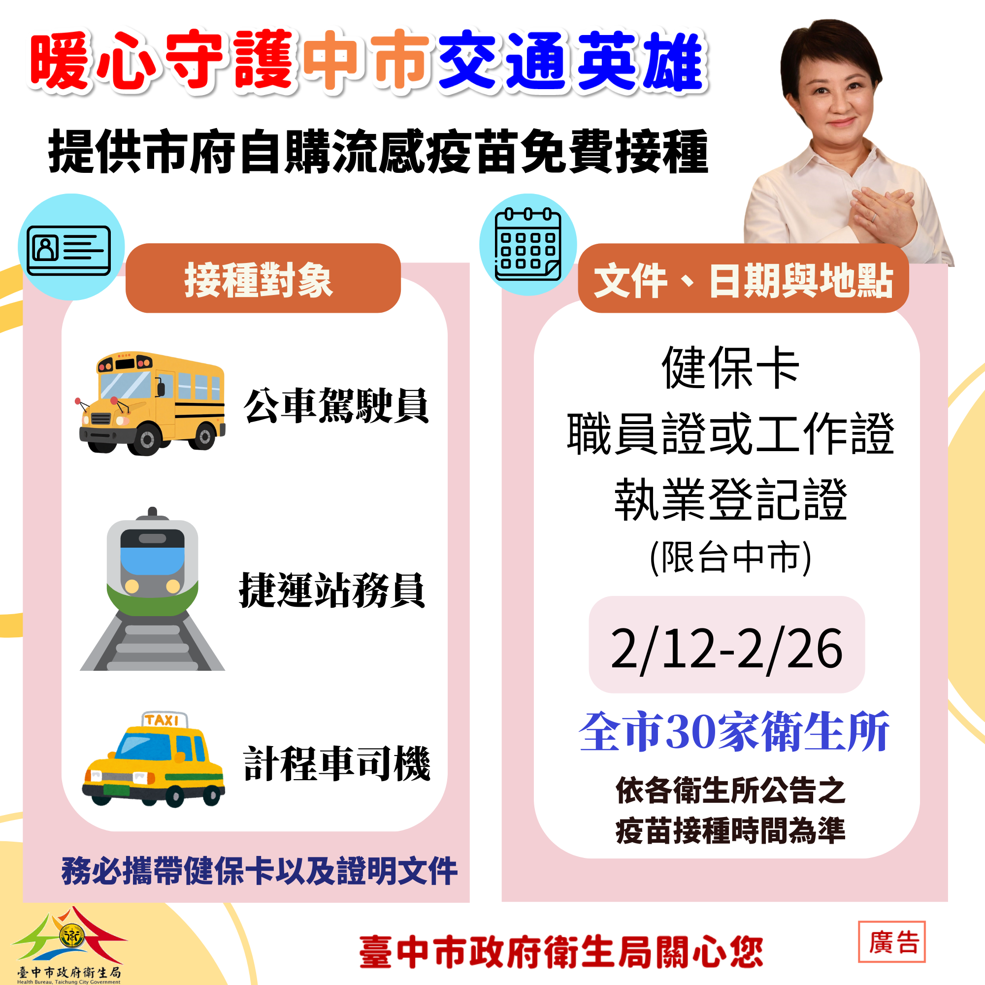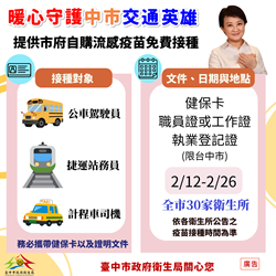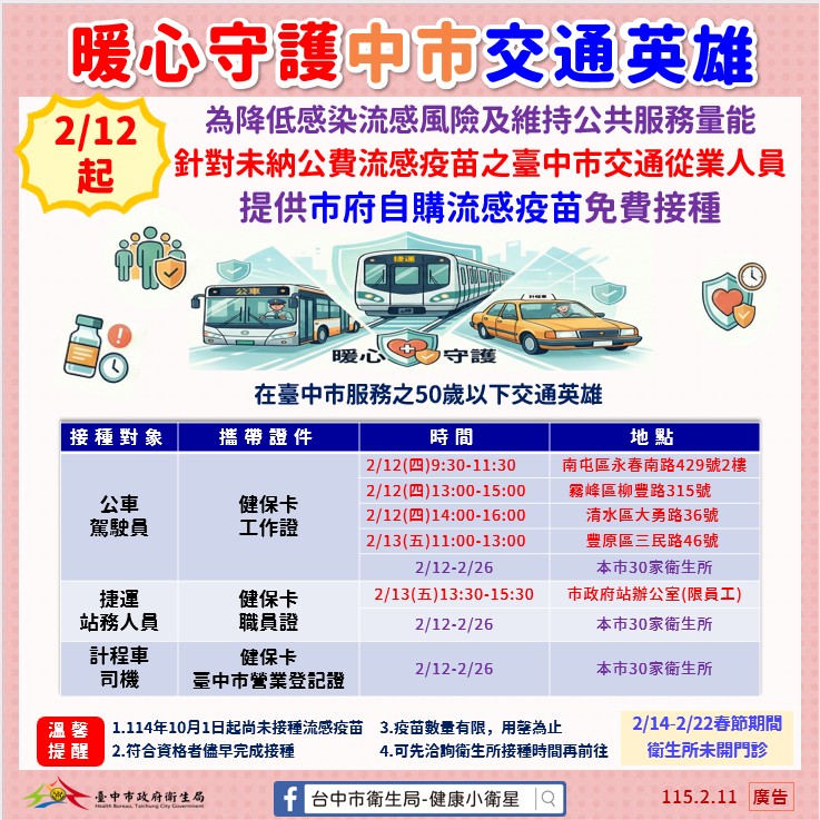 為守護第一線大眾運輸從業人員健康,台中市政府衛生局主動補足公費政策防護缺口,自2月12日至2月26日提供公車駕駛員、捷運站務人員及計程車司機免費接種市府自購流感疫苗,感謝長年默默守護城市運轉的「交通英雄」,讓他們在服務市民的同時,也能獲得完善健康保障。