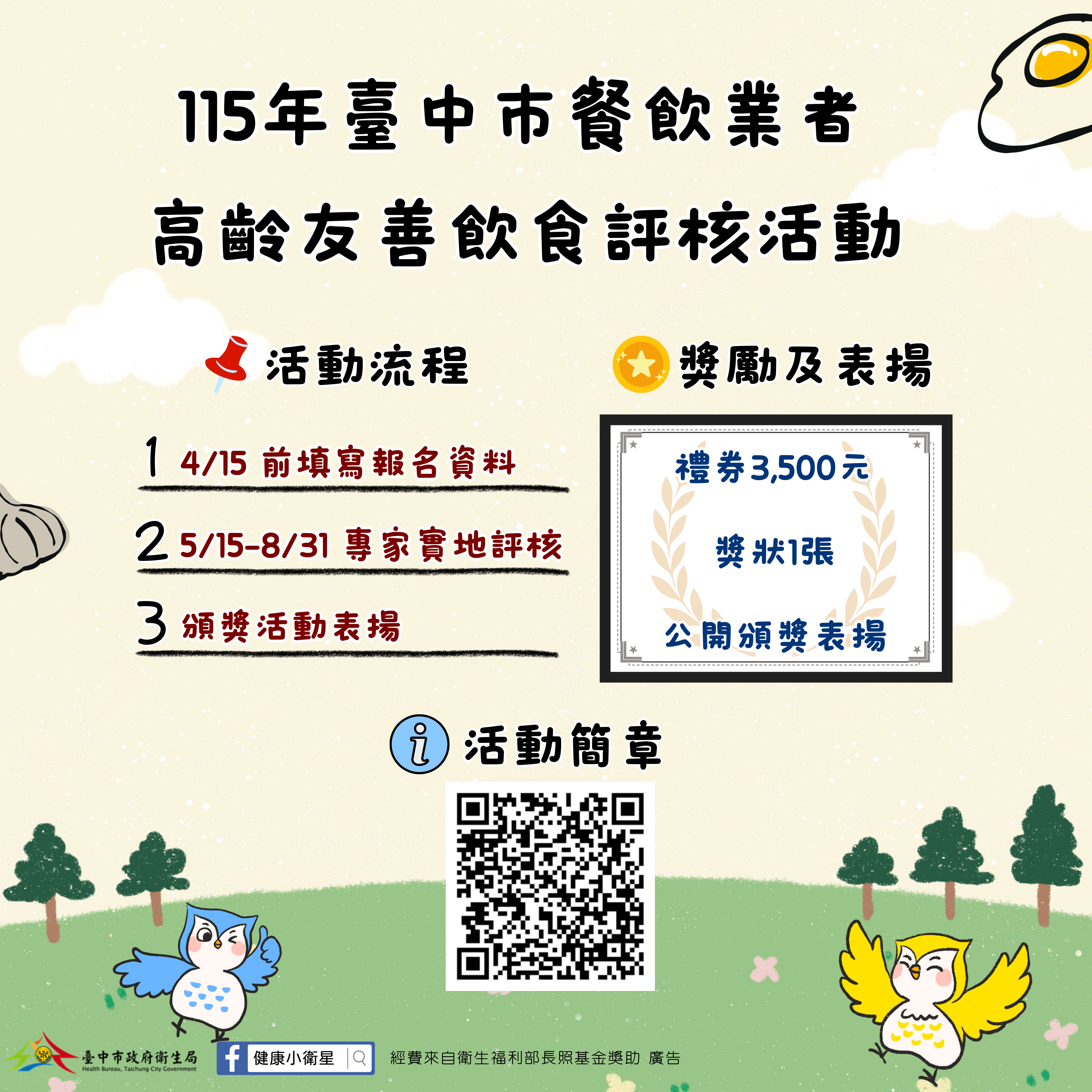 因應高齡人口持續成長,長者飲食需求與照護模式須同步升級。台中市政府衛生局於115年再度辦理「台中市餐飲業者高齡友善飲食評核活動」,即日起正式啟動,邀請中市各類餐飲業者推出符合長者需求的餐食,經評核通過者將予以表揚與獎勵,推廣高齡友善飲食理念,提升長者健康與生活品質。