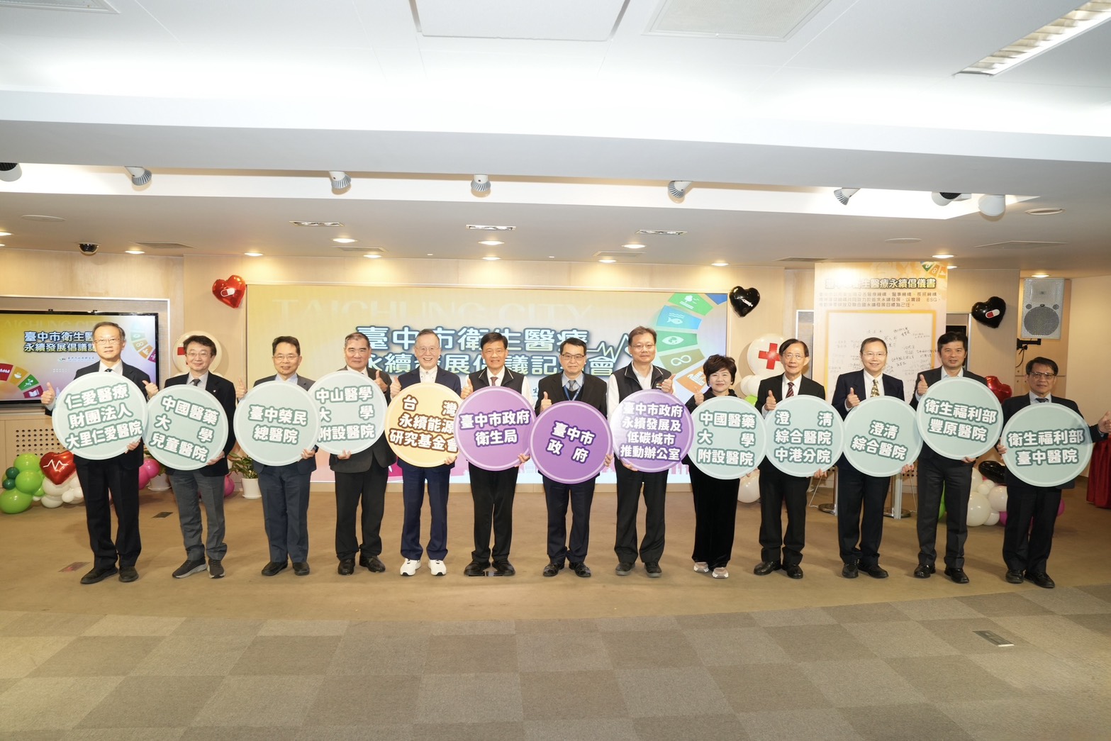今日活動包括市府秘書長黃崇典、永續發展及低碳城市推動辦公室執行長李逸安、衛生局長曾梓展、台灣永續能源研究基金會董事長簡又新,中山附醫總院長蔡明哲、台中榮總副院長吳杰亮、中國附醫副院長楊麗慧、中國兒童醫院院長王志堯、澄清醫院總院長周思源、院長洪尚祐、大里仁愛醫院院長龔嘉德、國軍台中總院院長施宇隆以及台中市區域級以上醫院、15個醫事公協會、11家機構代表與各區衛生所代表共同出席見證。