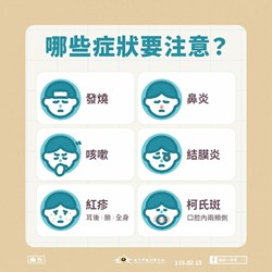 也提醒台中市各級醫療院所於民眾就醫時應落實TOCC(旅遊史、職業別、接觸史及是否群聚)等資訊詢問,臨床醫師如果發現病人具有出疹、發燒,同時有咳嗽、流鼻水或結膜炎等疑似麻疹症狀,請儘速協助病人適當隔離,並於24小時內完成通報,以利衛生單位爭取防治時效,避免疫情擴大。