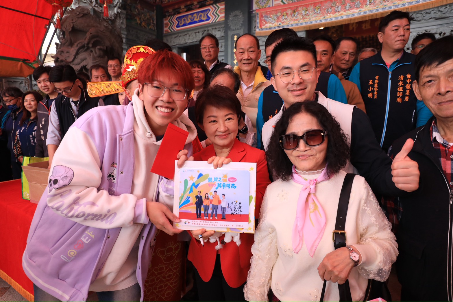 民政局指出,現場民眾踴躍參與,來自大雅區、45歲的陳先生,在大里七將軍廟順利領到頭香小紅包。陳先生表示,透過臉書得知市長將在這裡發放小紅包的消息,因此昨晚11點值完義警勤務後,便立刻趕到廟前排隊,希望搶得頭香、沾沾市長喜氣。今年是他第4年排隊領取市長小紅包,這回首度拔得頭籌,讓他格外開心,也期盼新的一年能「馬上有錢、馬上幸福、馬上行大運」。
