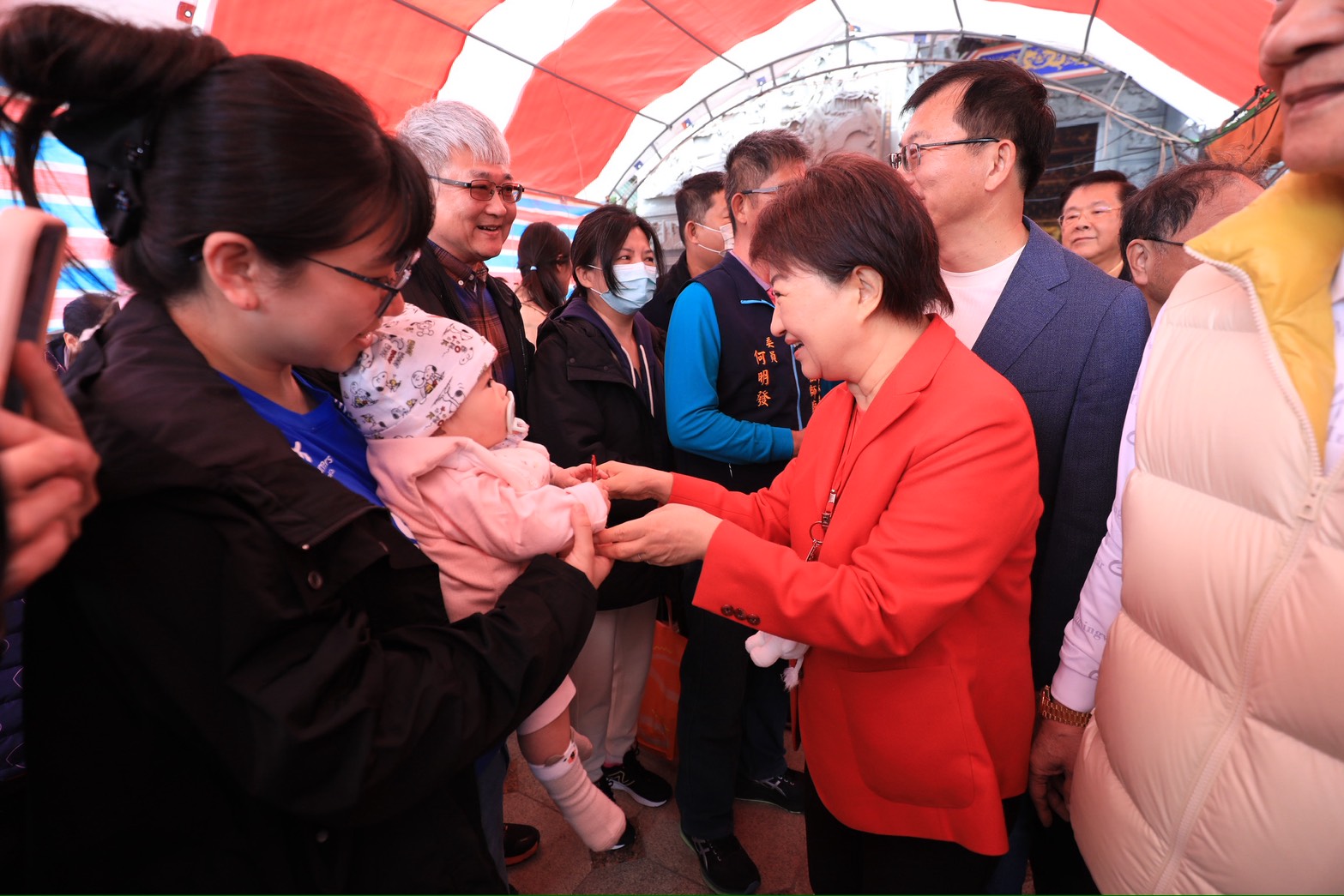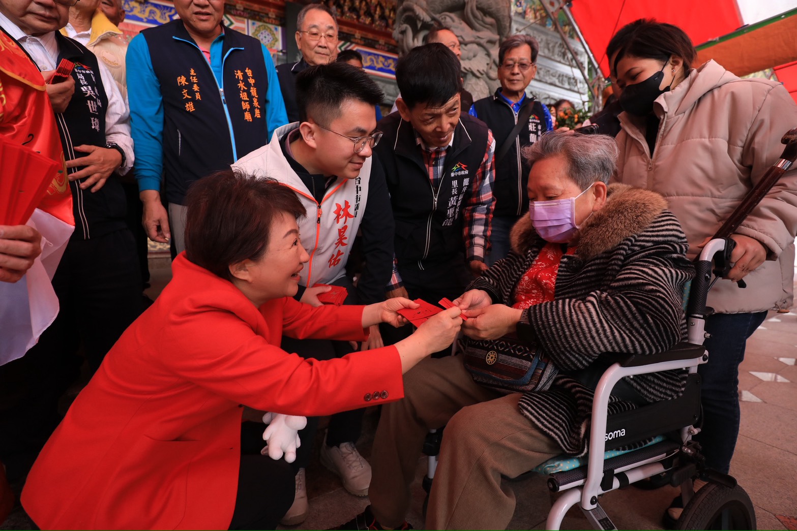 喜迎金馬年!大年初一台中市長盧秀燕一早展開宮廟走春行程,接連前往大里區七將軍廟、西屯區永安宮、潭子區潭水亭及龍井區龍泉岩為市民參香祈福,並發送「馬到金來」小紅包分享新春喜氣。現場民眾大排長龍,甚至有民眾昨晚11點就來排隊,只為了搶得新春好彩頭。盧市長除了向市民拜年祝賀外,也向神明祈福許下三個心願:期盼國泰民安、市政昌隆、廟宇香火鼎盛,迎接福兆一整年。