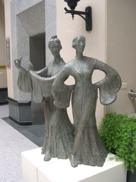 在石色線條的律動中,兩位舞者以優雅的姿態展示著古典的韻味。她們的手臂宛若流動的水,裙裾如同微風拂過的湖面,訴說著千年的故事。這靜止的瞬間,彷彿在無聲中奏響了一曲悠遠的旋律,將觀者引入夢境般的時空交錯。