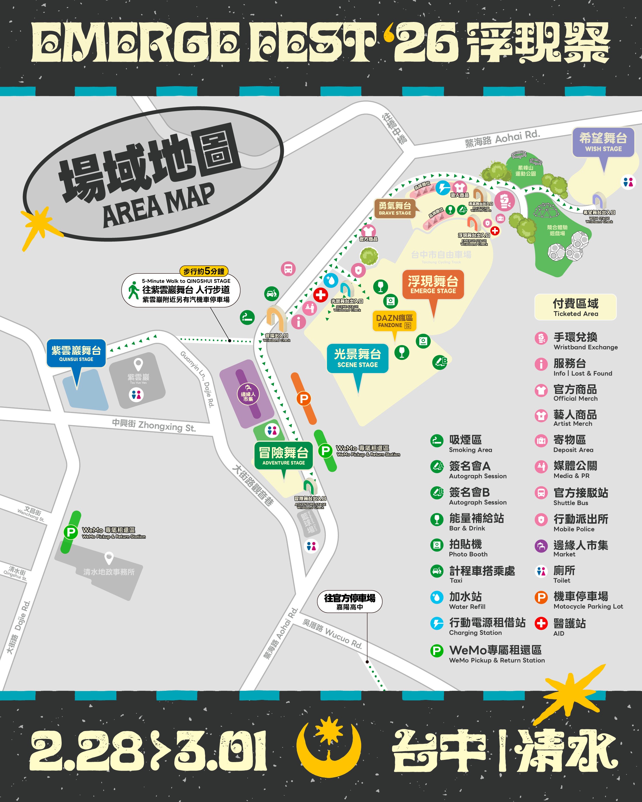 2026年台灣指標性音樂節「浮現祭(EMERGE FEST)」將於228日至31日在台中清水鰲峰山運動公園盛大登場,預估活動期間將吸引約5萬人次湧入清水地區。台中市政府已完成跨局處整備,包含交通疏導、秩序維護、現場安全與周邊環境整潔等措施,並呼籲樂迷提早規劃行程,善用大眾運輸與相關接駁措施,共同讓進場更順暢、觀賞更安心。