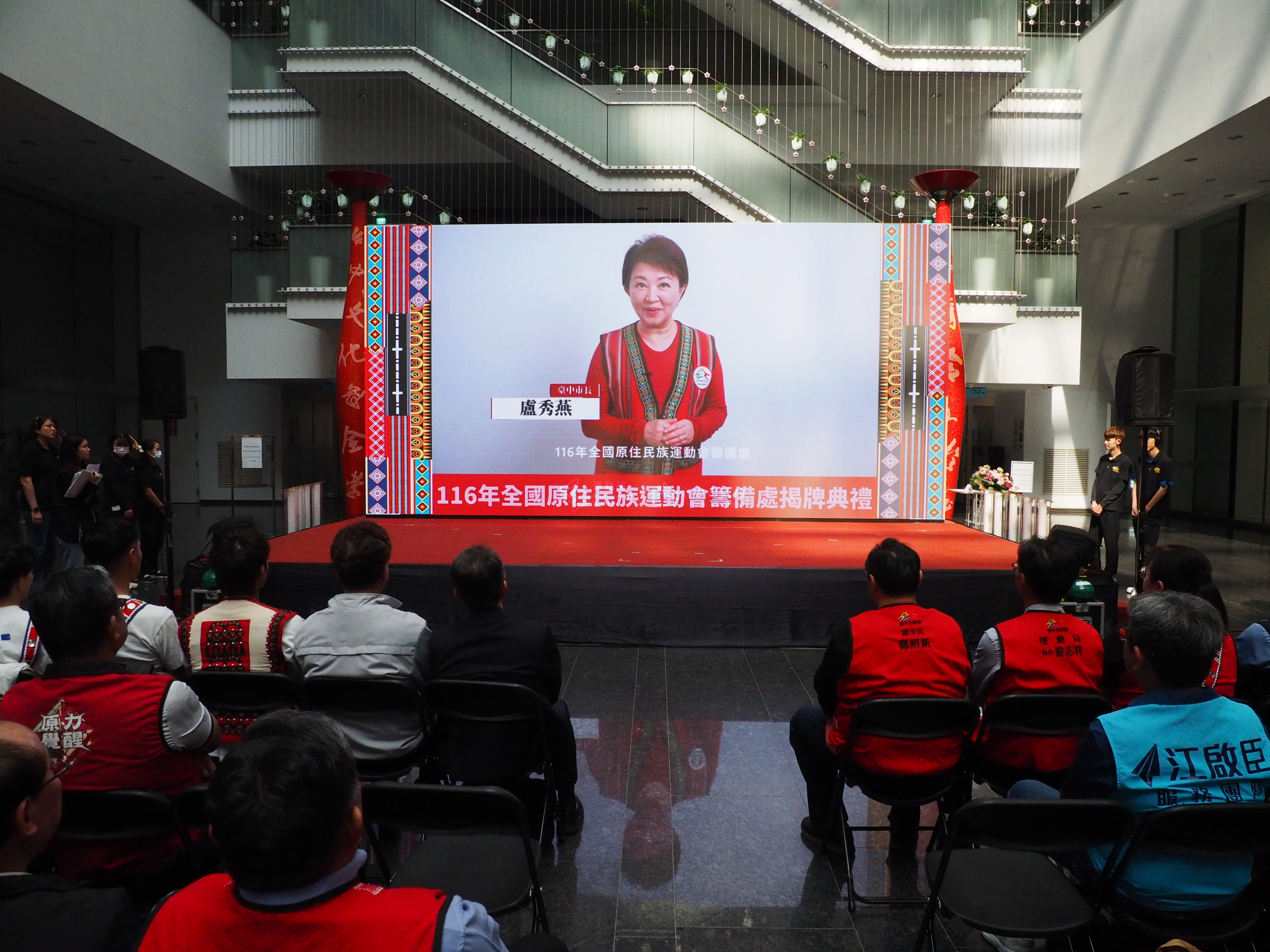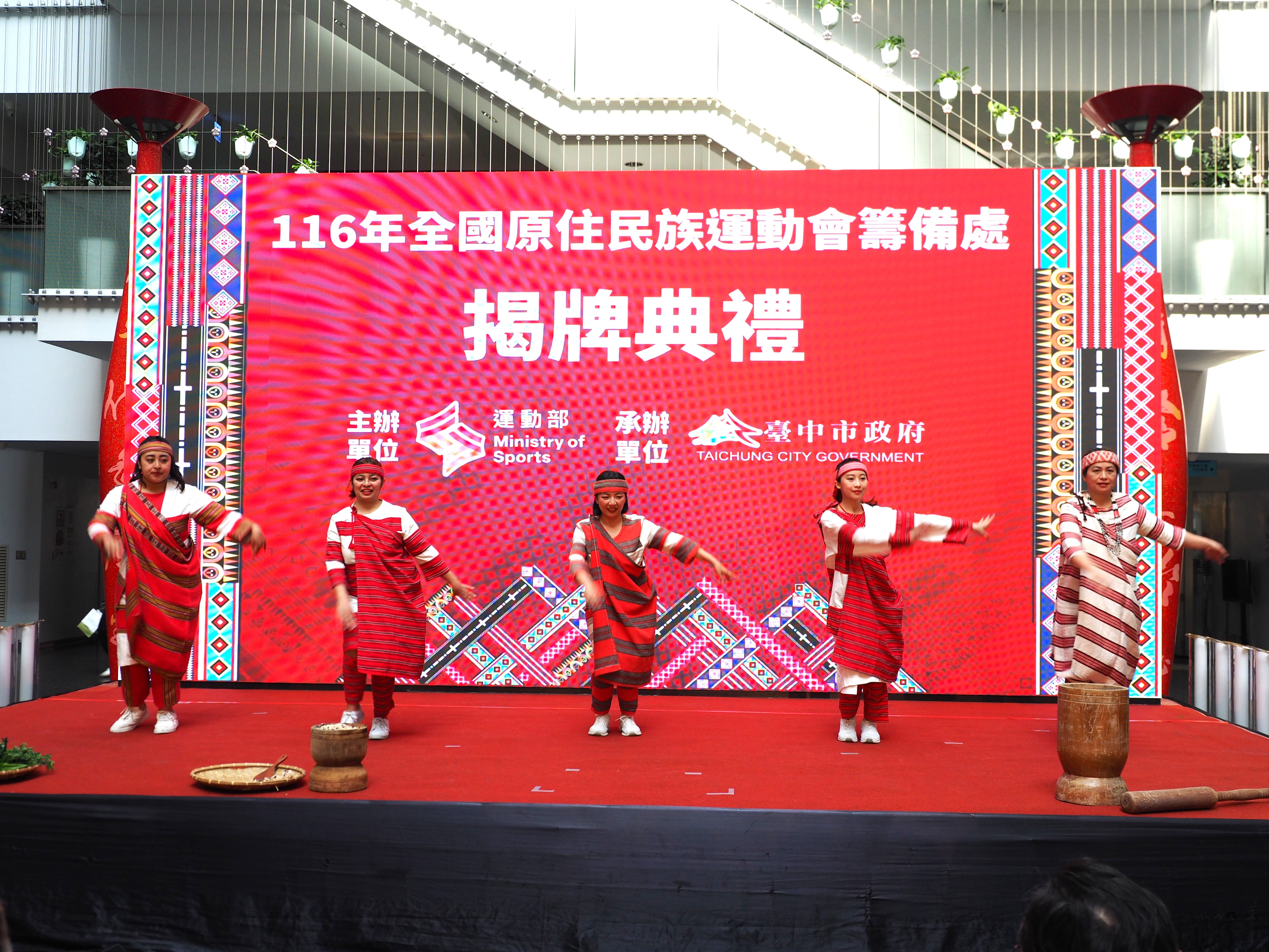 116年全國原住民族運動會籌備處今(26)日在市府文心樓一樓中庭正式揭牌,典禮以原住民族特色樂舞揭開序幕,現場邀請台中市原住民健將陳傑及奧運柔道國手楊勇緯及林真豪到場力挺,象徵原住民族運動精神的傳承與延續。副市長鄭照新代表盧市長出席,與現場貴賓共同啟動揭牌儀式,正式宣告賽會將於明年3月26日至29日在台中登場,屆時歡迎全國16族、超過8,000名原住民隊職員將齊聚台中,切磋競技!