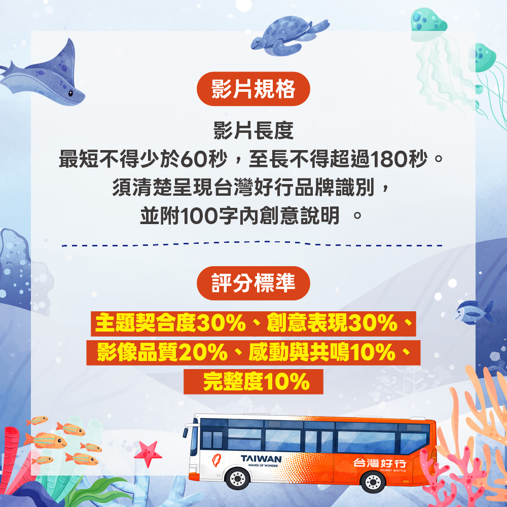 中市府觀旅局長陳美秀表示,這次活動旨在提升台中海線的觀光能見度與大眾運輸使用率。不同於傳統的觀光宣傳,徵件特別強調「個人風格」與「創新視角」,參賽者需以「679台中活力海洋線為核心」,規劃1至3分鐘的精彩影片,內容須涵蓋沿線景點或特約店家,並在作品中展現台灣好行品牌識別,讓大眾看見不一樣的海線景致。