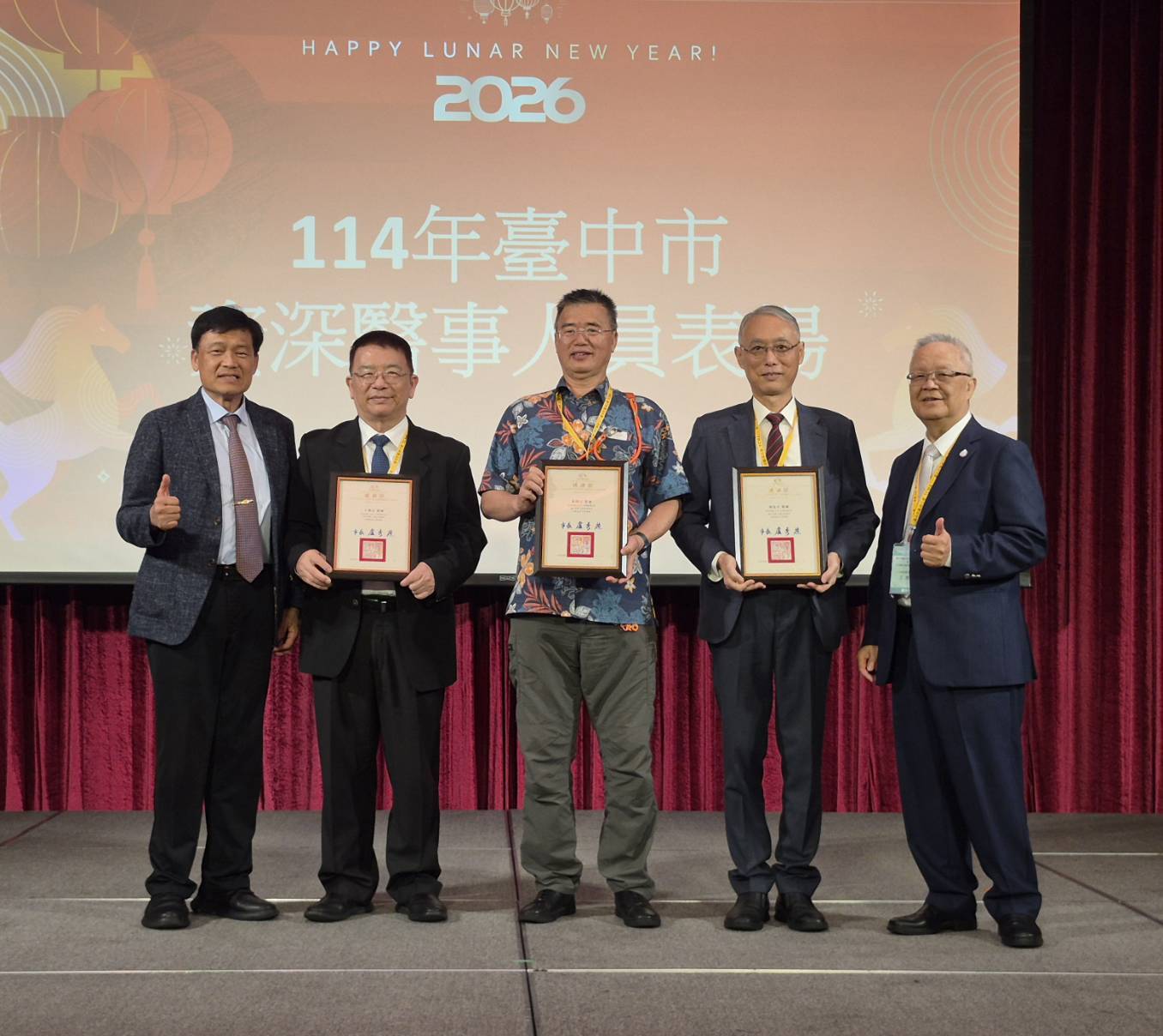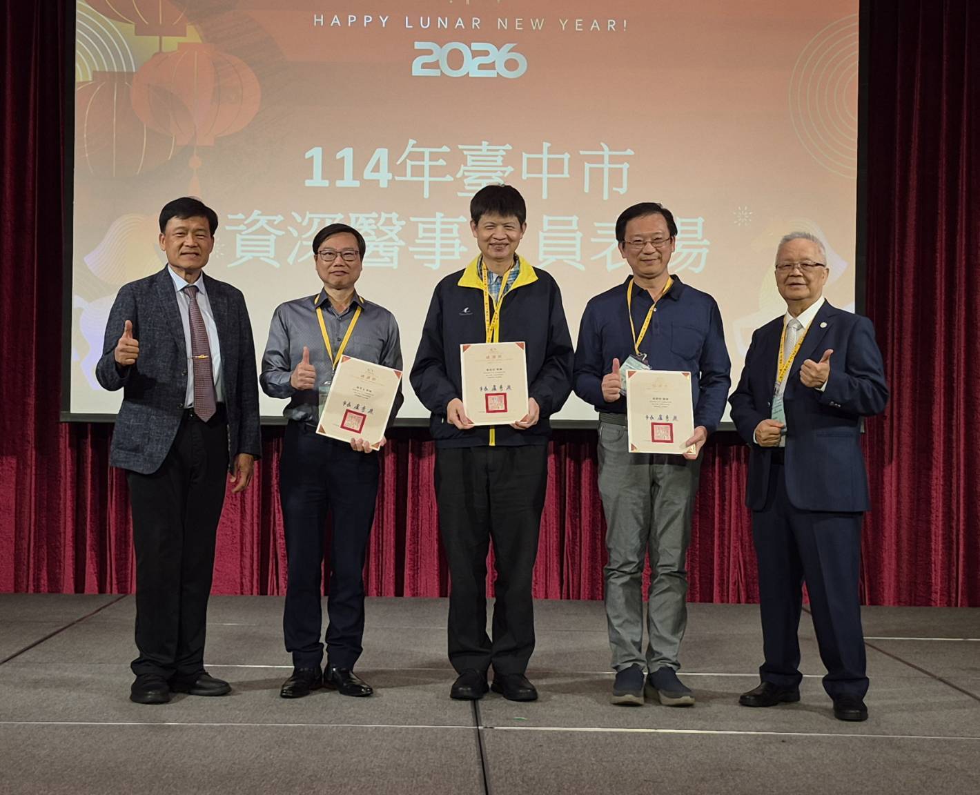 社團法人台中市醫師公會今(1)日舉辦春節聯誼晚會,台中市政府衛生局長曾梓展到場感謝醫師奉獻付出,並表揚「114年M痘疫苗施打獎勵方案」執行醫療院所,以及感謝資深醫師長期奉獻。