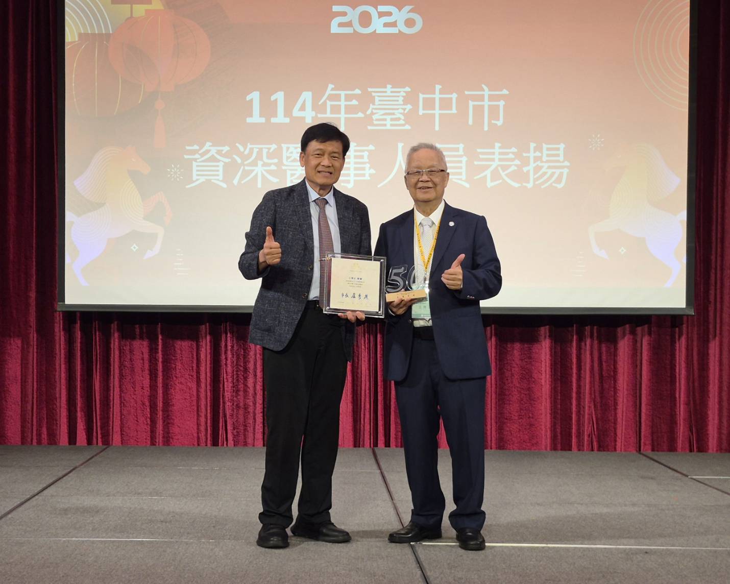 此外,市府為表彰資深醫師長期維護市民健康所做的奉獻,特別透過本次的公會活動,頒發感謝狀(牌)予去(114)年度服務年資滿30、40、50、60年之資深醫師,感謝這些資深醫師長期以來,為維護市民健康及提升中市醫療品質所做的努力,其中服務滿30年共62人、滿40年共56人、滿50年共21人,滿60年3人,符合表揚資格者共142人。(3/1*15)*衛生局