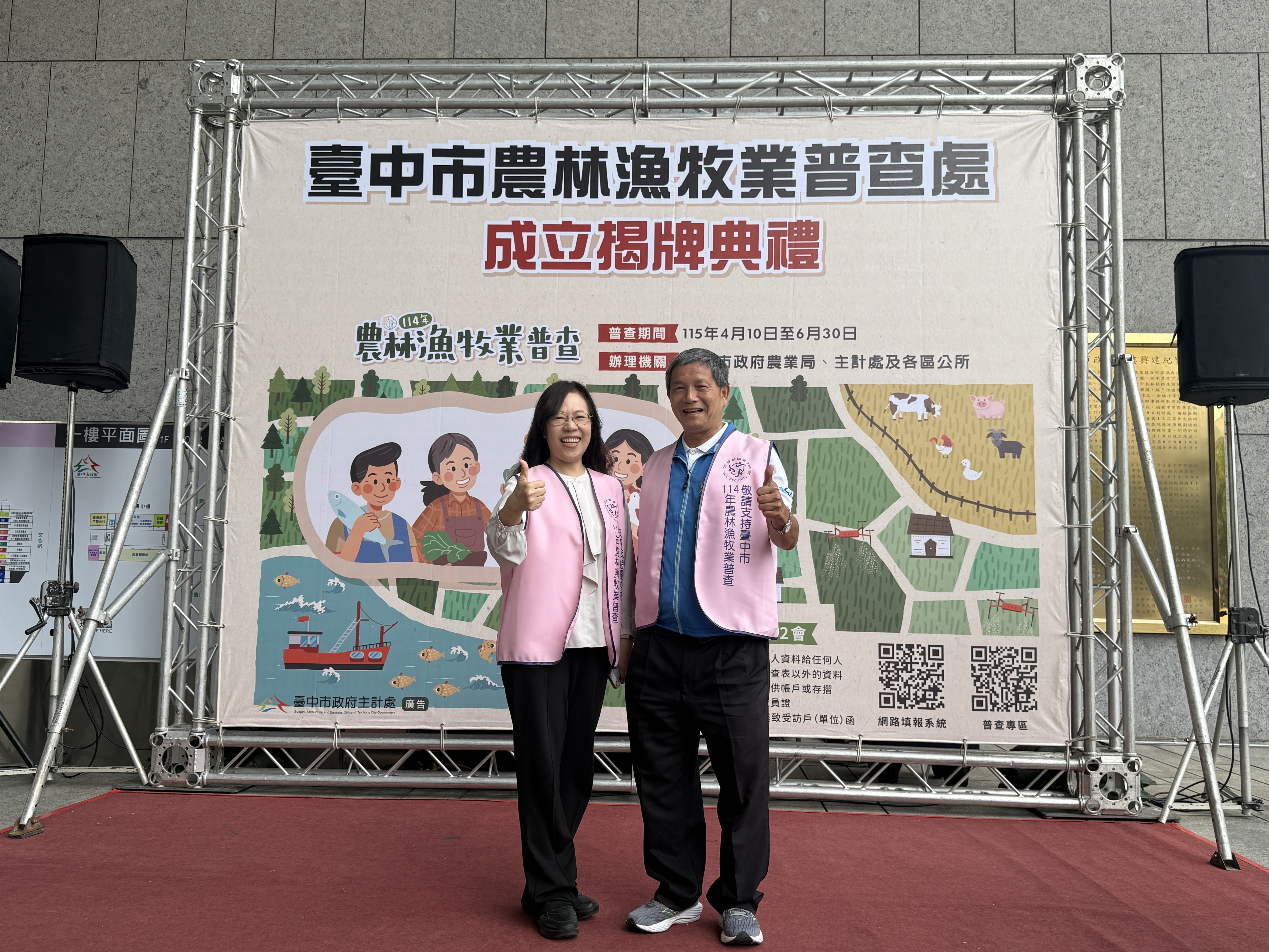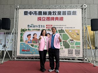 「114年農林漁牧業普查」將於今年正式展開,為順利推動普查工作,台中市政府於今(2)日上午10時在市府大門口舉行「台中市農林漁牧業普查處」揭牌典禮。典禮由副市長賴淑惠代表市長盧秀燕主持,並與民政局長吳世瑋、主計處長林淑勤及農業局副局長蔡勇勝等人共同揭牌。賴副市長強調,農業是國家的根基,呼籲農民朋友配合支持,讓普查數據成為優化台中市農業施政的重要依據。