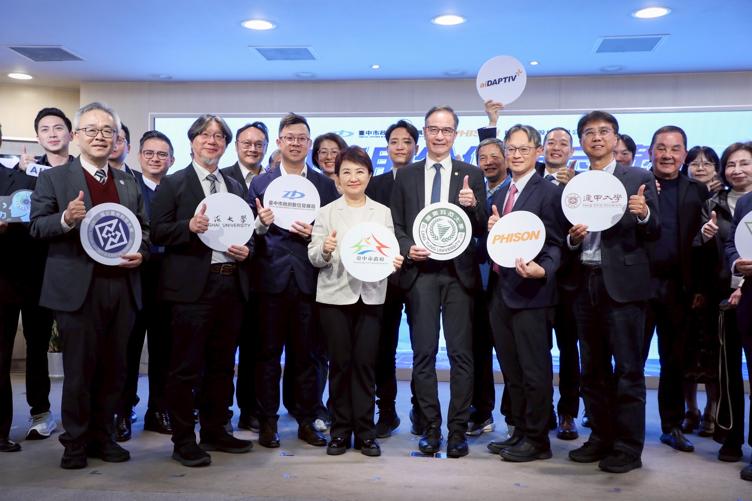 今日活動現場盛況空前,產官學研各界菁英齊聚一堂,共同見證台中邁向 AI 城市的重要里程碑。記者會包括市長盧秀燕、立法委員黃健豪、羅廷瑋、廖偉翔,市議員劉士州、邱愛珊、黃馨慧;市府團隊則由數位局長林谷隆、研考會主委林鼎超、警察局長吳敬田、文化局長陳佳君、法制局長李善植、新聞局長欒治誼、運動局長游志祥、工策會副總幹事林家興及各局處代表共同出席,市政顧問王志遠、謝孝杭亦到場支持。