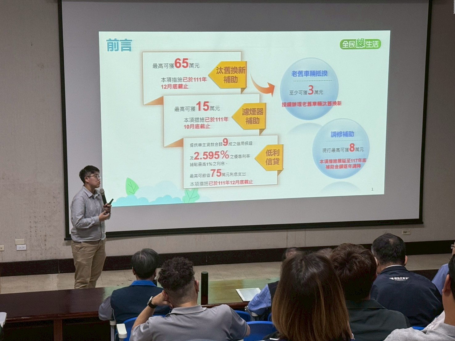 台中市政府環境保護局今(5)日舉辦「台中市柴油車調修補助及多元排煙檢測宣導說明會」,向台中市相關公會、車主及汽車修理業者等共計100家公私場所,說明最新修正的「大型柴油車調修燃油控制系統或加裝空氣污染防制設備補助辦法」內容,鼓勵符合補助資格者踴躍提出申請,以維護良好車況, 減少污染排放。