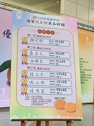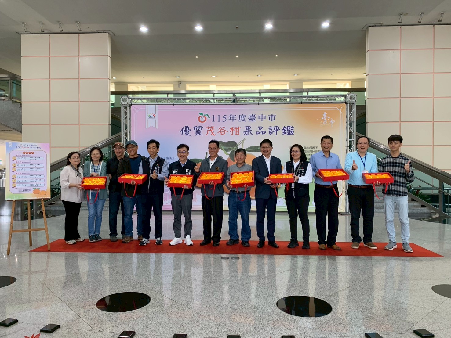 為透過農產品評鑑提升台中市茂谷柑的品質與食用安全,讓消費者安心選購在地優質的農特產品,建立台中市優質茂谷柑市場品牌,台中市政府農業局輔導東勢區農會於今(6)日在台中市政府陽明市政大樓1樓大廳舉辦「115年度台中市優質茂谷柑果品評鑑活動」,共計60組農友報名參賽,最終由東勢區謝世新勇奪冠軍殊榮。