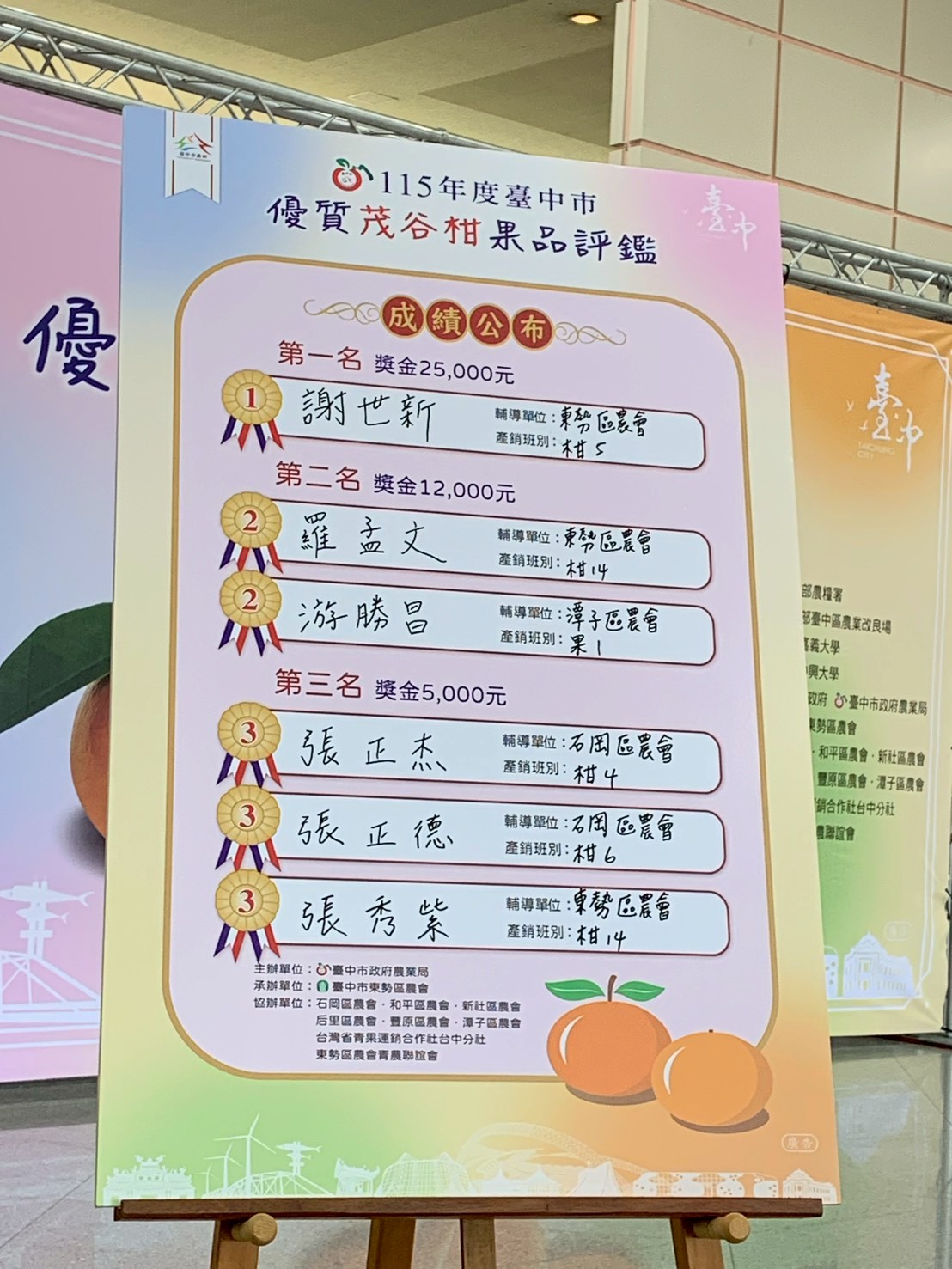 農業局說明,這次評鑑活動邀請農業部台中區農業改良場、國立中興大學、國立嘉義大學等農業學術研究單位專家學者擔任評審,就果品外觀包含清潔、形狀、色澤均一度、大小與整齊度、風味與肉質、糖度等項目,經評審仔細檢視及品嘗評分後,由東勢區謝世新勇奪冠軍,成為今年度的茂谷柑王,可獲得獎牌及獎金2萬5,000元;第二名為東勢區羅孟文及潭子區游勝昌,可獲得獎牌及獎金1萬2,000元;第三名分別為石岡區張正杰、石岡區張正德及東勢區張秀紫,可獲得獎牌及獎金5,000元。