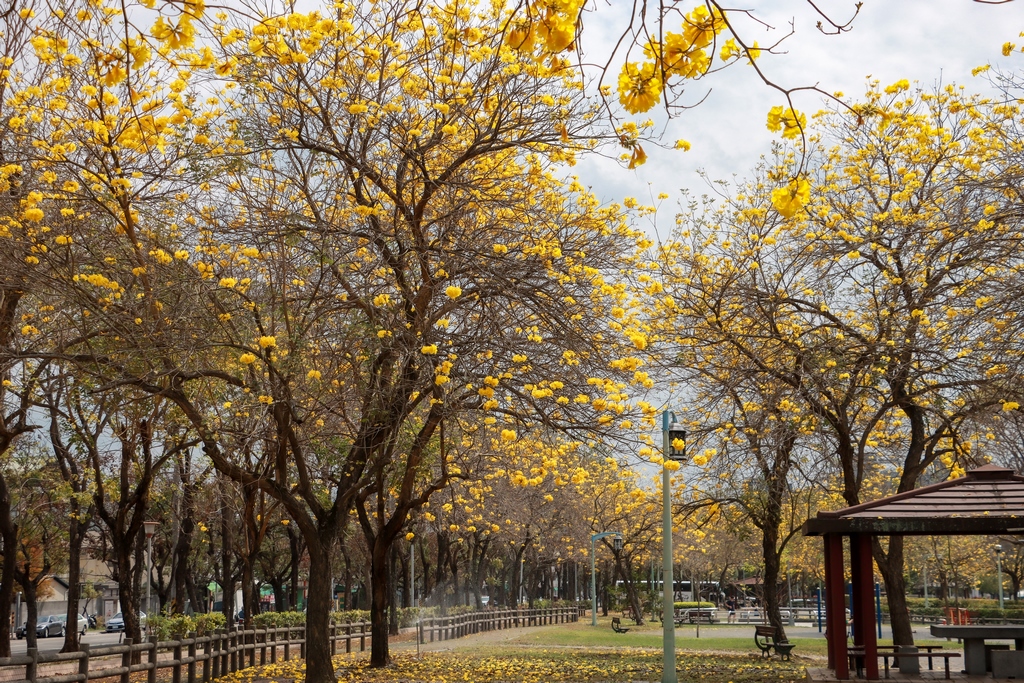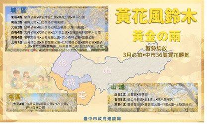 建設局長陳大田表示,今年黃花風鈴木花季預估自3月上旬進入盛開期,最佳觀賞時間約可持續至3月下旬,實際花況仍將視天候狀況略有差異。近期市區多處黃花風鈴木已陸續綻放,金黃色花朵在枝頭燦爛盛開,形成亮麗花景,如北屯區新都生態公園、廍子公園,南屯區豐富公園與環中路四段,以及東區泉源公園、北區台中公園等地,皆是熱門賞花地點,邀請民眾把握花期前往感受滿城花海的春日風情。