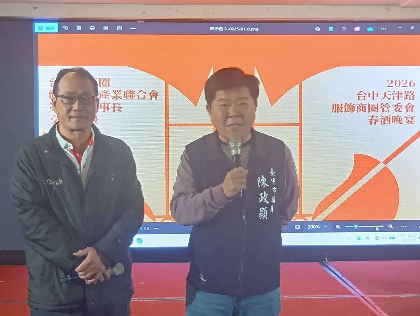 台中市商圈觀光文化產業聯合會第五屆理事長交接典禮昨(9)日晚間舉行,台中市政府經濟發展局長張峯源代表市長盧秀燕出席與會,見證新舊任理事長交接。此次活動結合天津路服飾商圈年度春酒晚宴舉辦,現場貴賓雲集、氣氛熱絡,象徵商圈凝聚向心力、持續推動台中商圈觀光與產業發展。