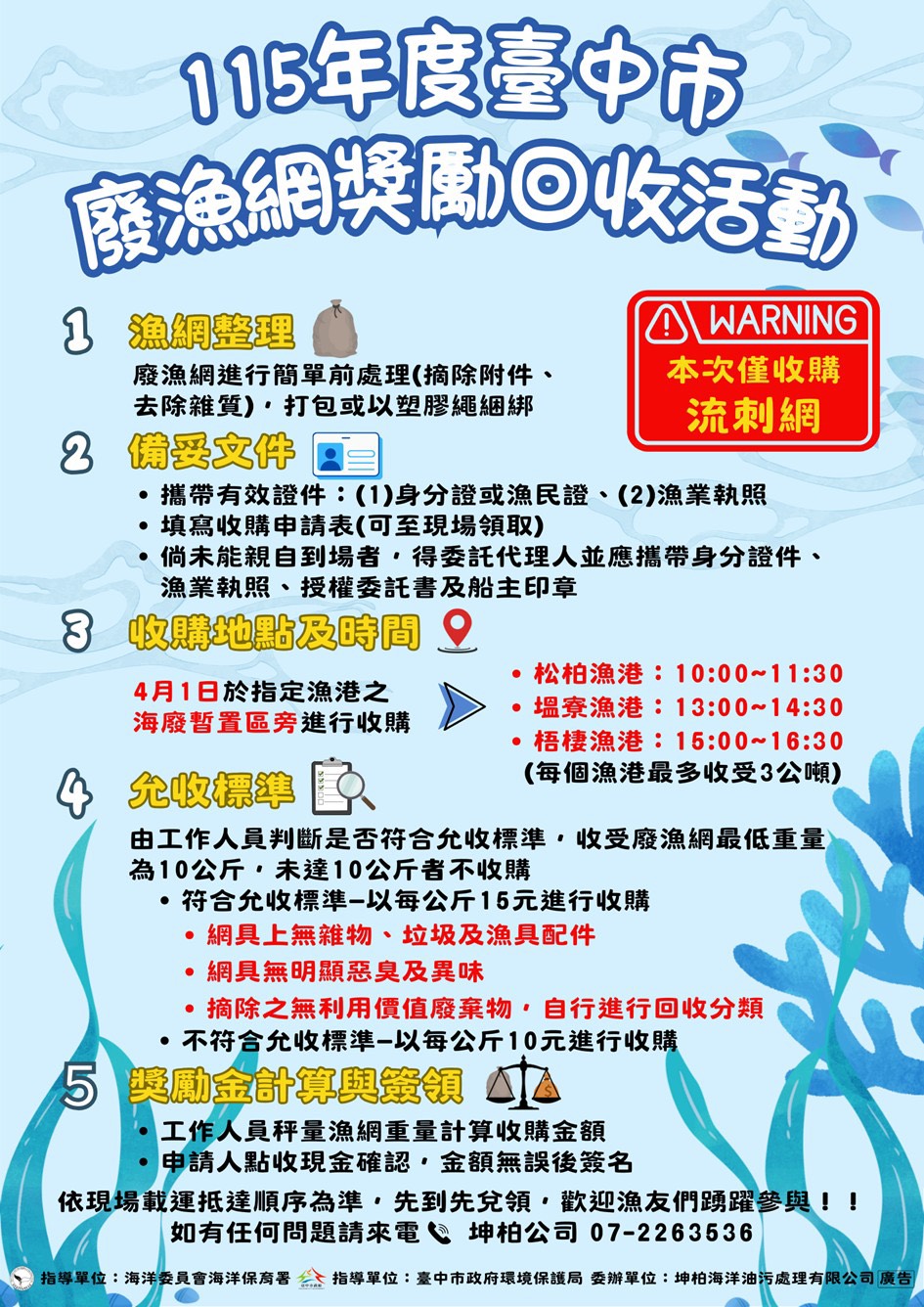 此外,為強化廢漁網回收機制,避免廢棄漁網流入海域造成污染,環保局已於115年3月7日在台中區漁會辦理「漁網回收機制說明會」,向轄內漁民說明廢漁網收購辦法,並預計於115年4月在梧棲、塭寮及松柏漁港等地辦理回收作業,透過建立回收管道,協助漁民妥善處理淘汰漁網,從源頭降低海洋污染風險。