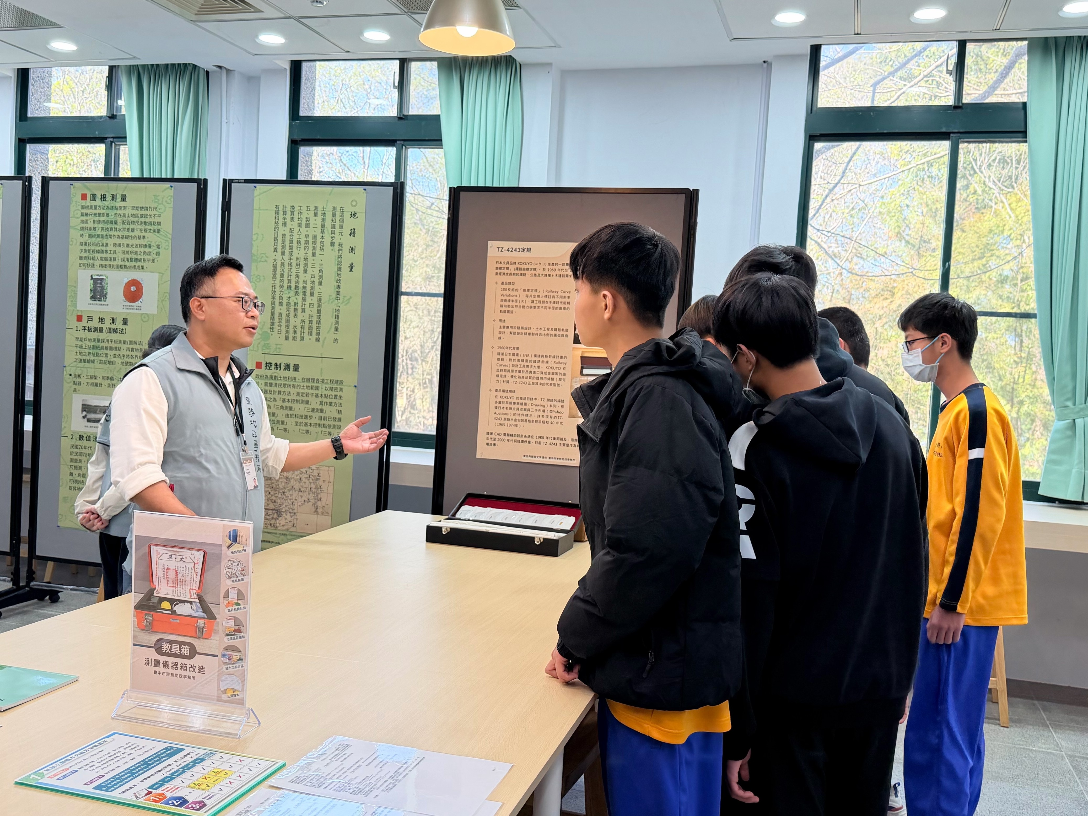 地政局說明,展場同時呈現甫獲教育部114年度校長領導卓越獎的東勢高工校長周文松與建築科主任許瑞昌所倡議的官學跨域合作理念,以及東勢地政事務所在校門旁埋設客家丁粄美化圖根點提供學術運用的成果。長期以來,東勢地政事務所也協助建築科學生進行測量儀器實作教學,並輔導學生考取專業證照與升學發展。透過海報與影像紀實,此次80週年校慶展覽展現官學合作的亮眼成果,也為跨機關合作樹立良好典範。