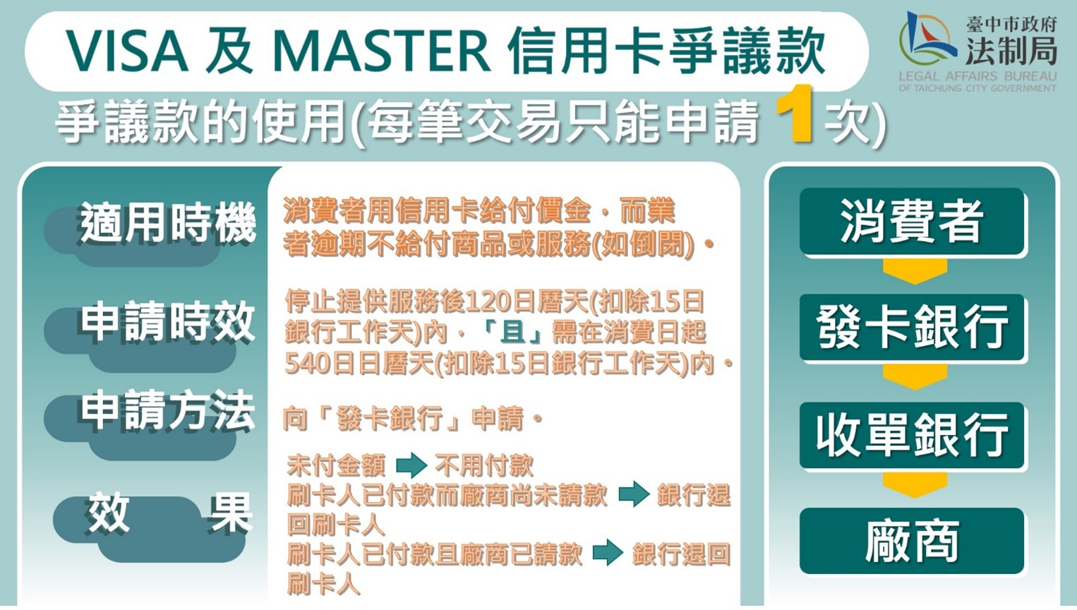 吳消保官補充,消費者若使用信用卡消費,遇有業者倒閉等原因而有商品(服務)未領取,致權益受損者,可檢附相關佐證資料(如刷卡簽單、業者結束營業訊息等)向信用卡發卡銀行申請爭議款,但因爭議款有申請期限(以VISA、MASTER 為例,自刷卡日起540日曆天且業者未提供服務起120日曆天內,以上日期需再扣除發卡行作業所需的15工作天,即使業者已經請款,消費者未使用的費用,仍可要求信用卡機構退還),且各家銀行所需資料不盡相同,建議消費者盡速向發卡銀行洽詢,以免延誤爭議款的申請時效。(3/17*17)*法制局
