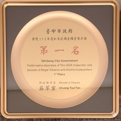 台中市113年度私劣菸酒查緝績效表現亮眼,經財政部評定榮獲全國第1名,私劣菸品及酒品查獲量亦雙雙名列全國第3名,展現亮眼查緝成果。台中市政府財政局日前於「115年度私劣菸酒查緝會報」中,由局長游麗玲代表市府接受財政部頒發獎牌及獎金肯定。