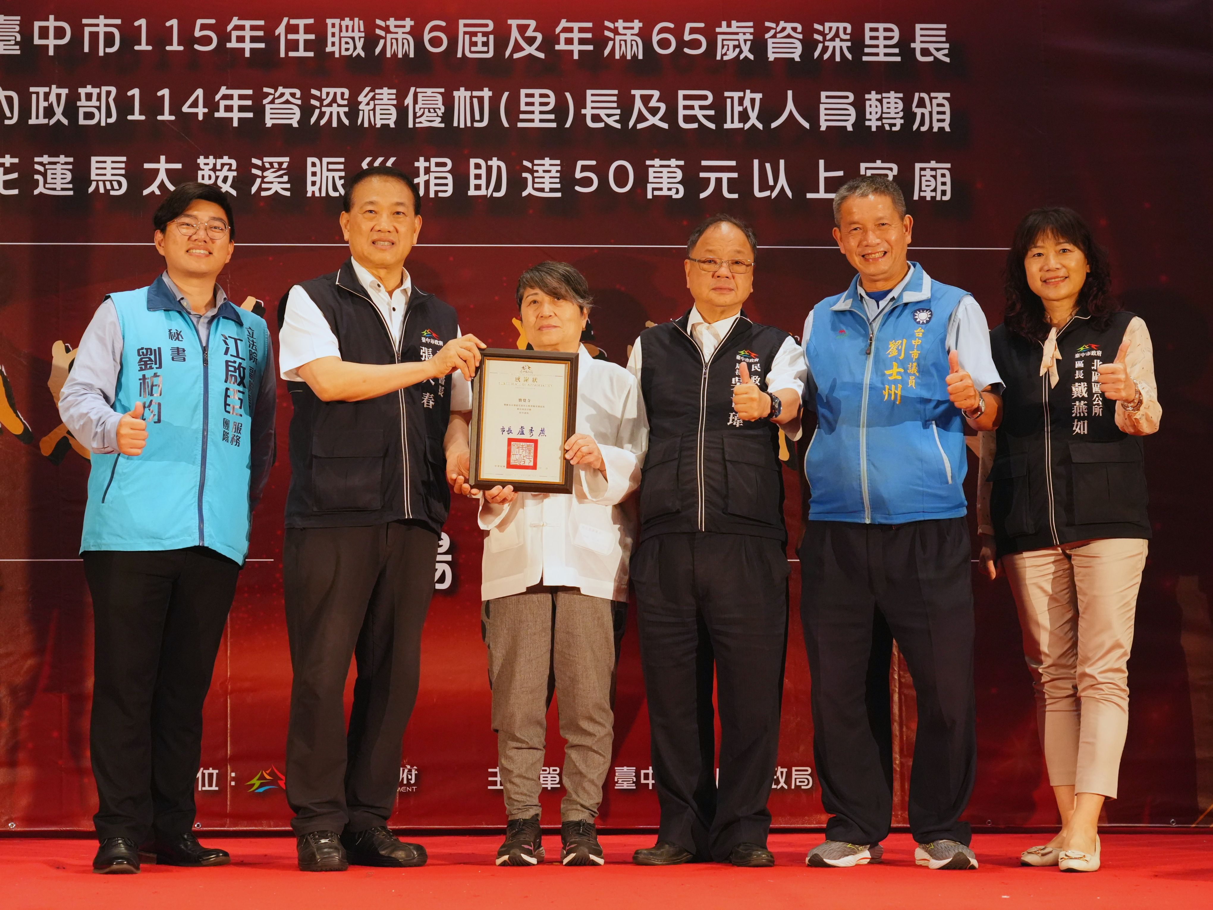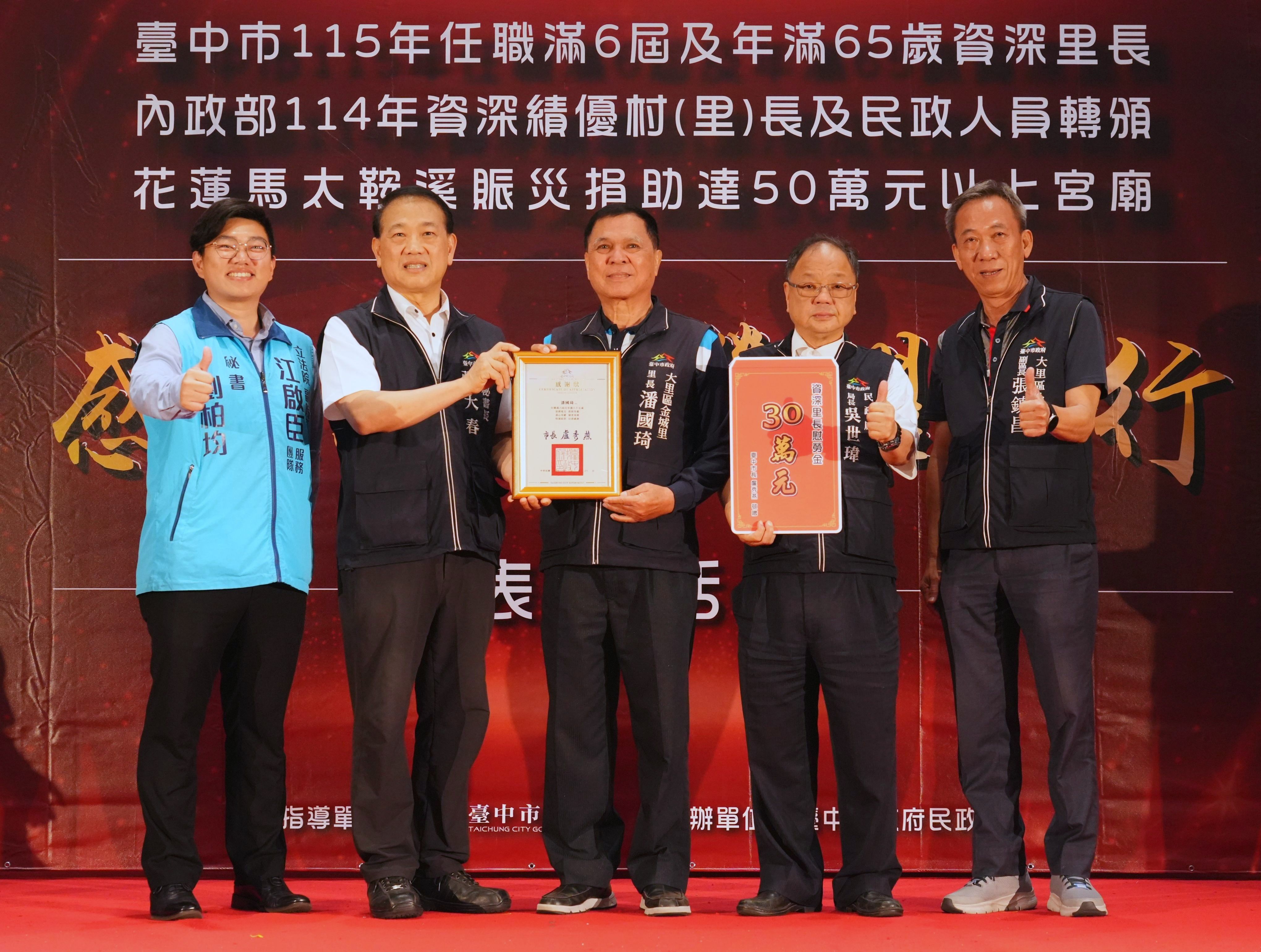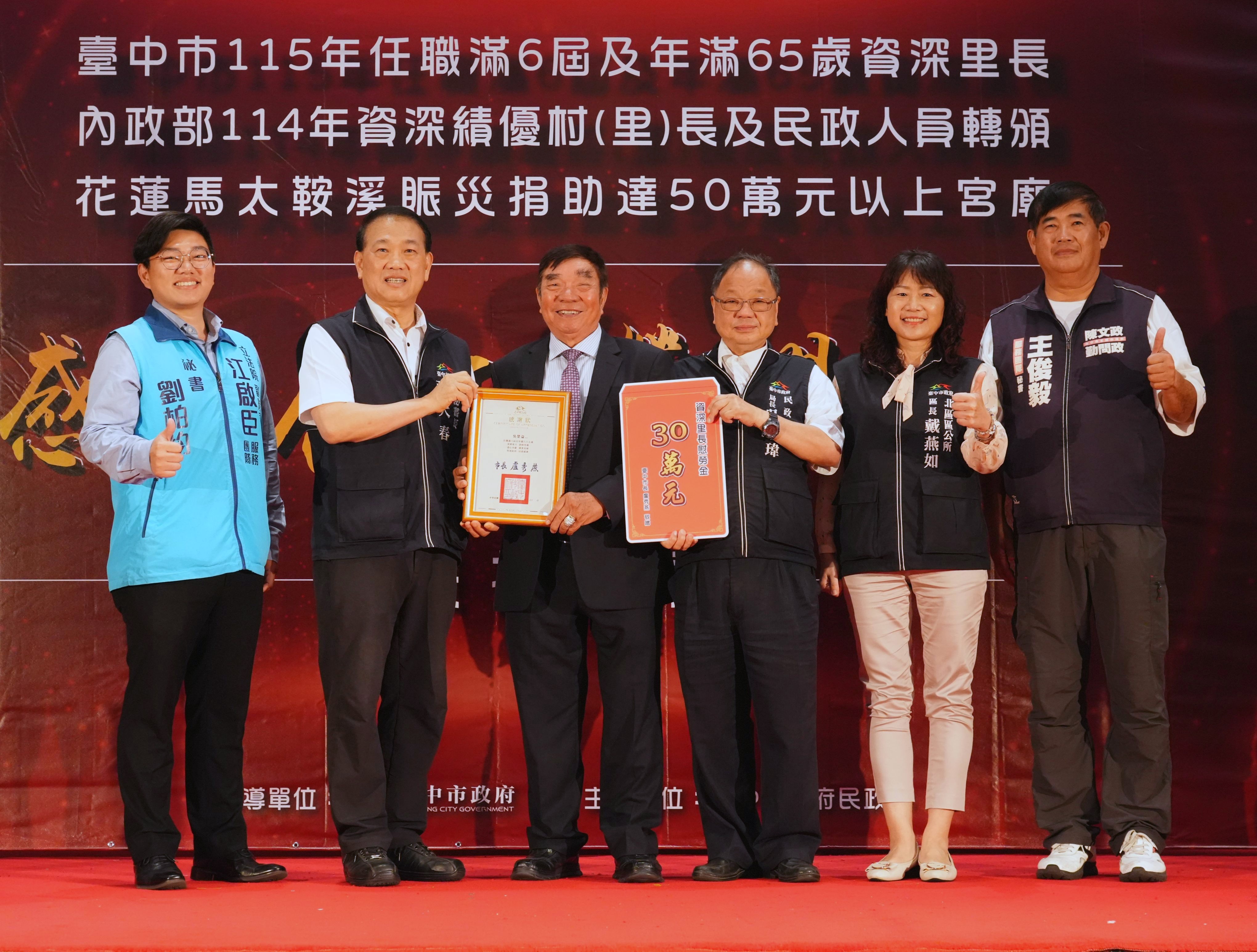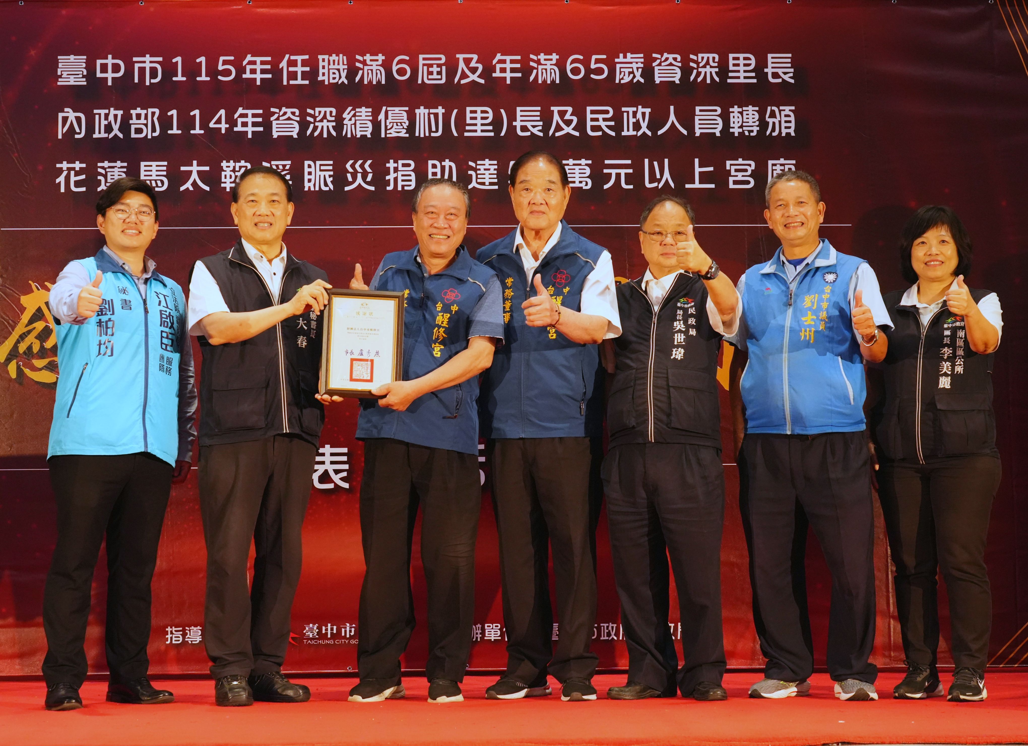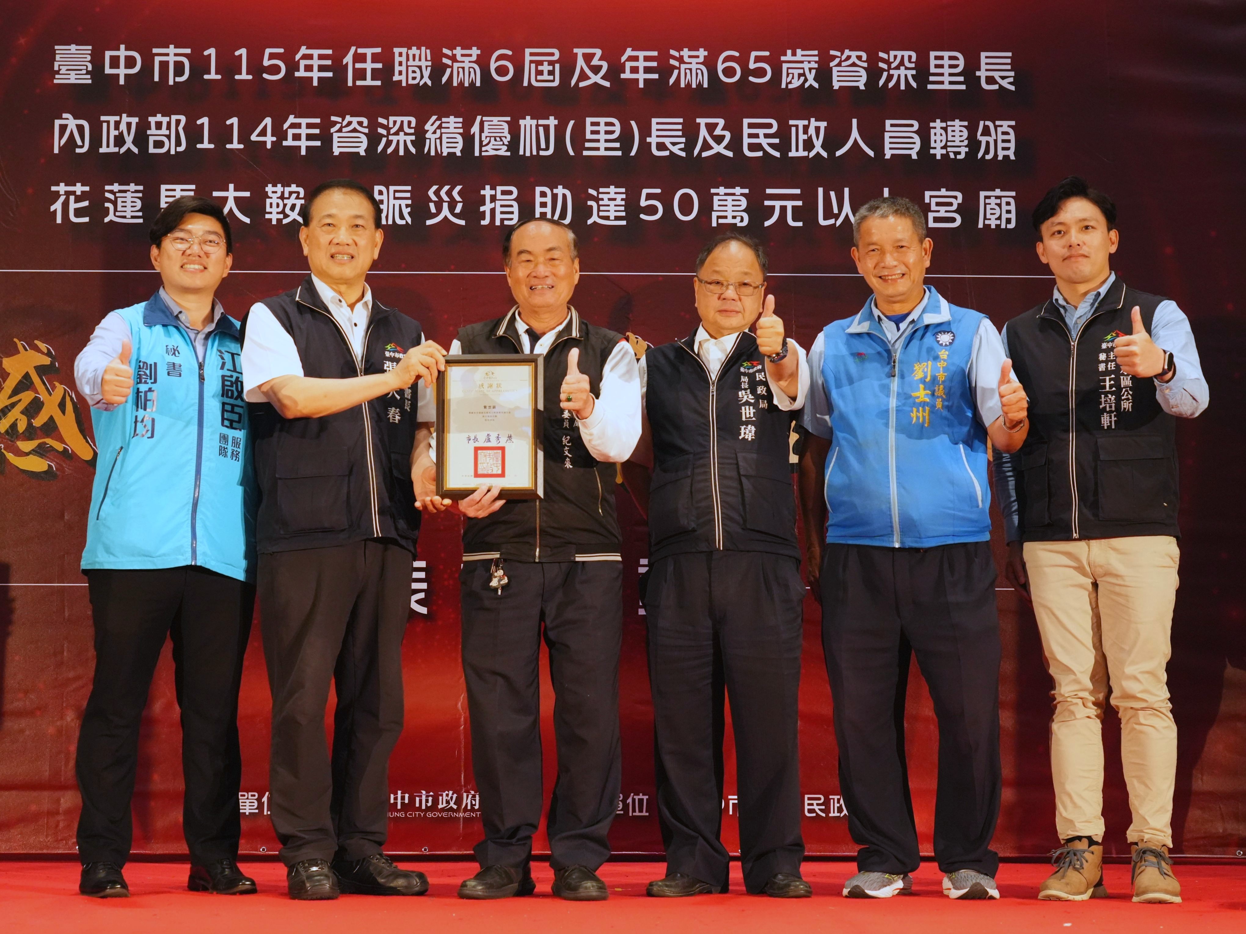 為感謝基層人員長年付出及宗教團體熱心公益,台中市政府民政局昨(25)日晚間舉辦「感恩有您,榮耀同行」表揚活動,表彰全市48位任職滿6屆且年滿65歲的資深里長,以及捐助花蓮馬太鞍溪賑災善款逾50萬元的7間宮廟代表,並轉頒內政部114年資深績優村(里)長及民政人員獎項。副秘書長張大春代表市長盧秀燕出席,肯定基層深耕地方、協助市政推動,也感謝宗教團體以實際行動回饋社會,傳遞溫暖善意。