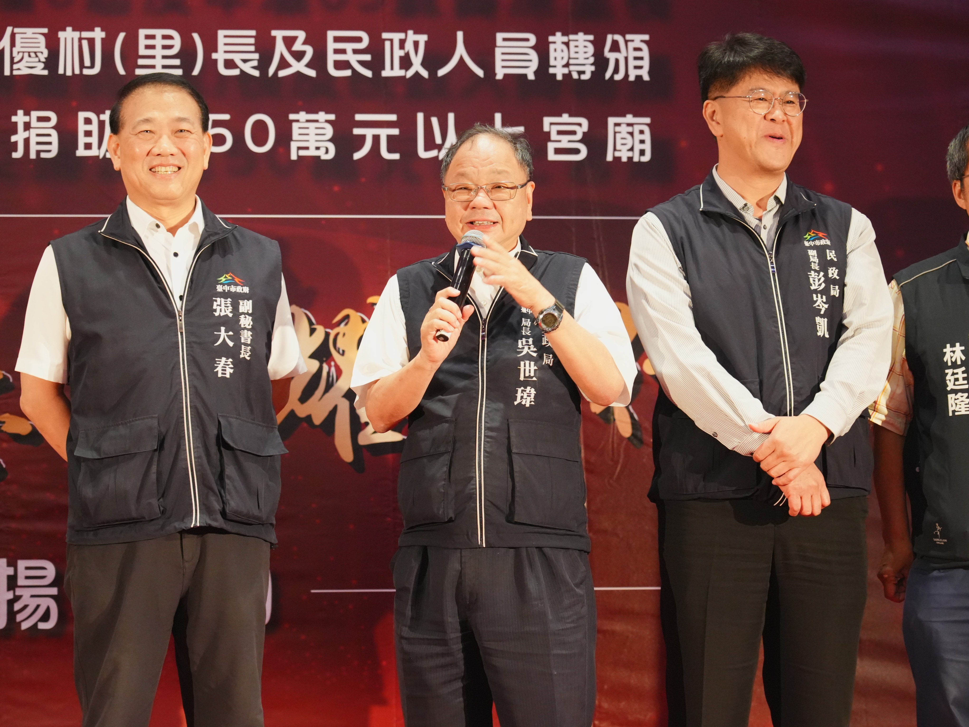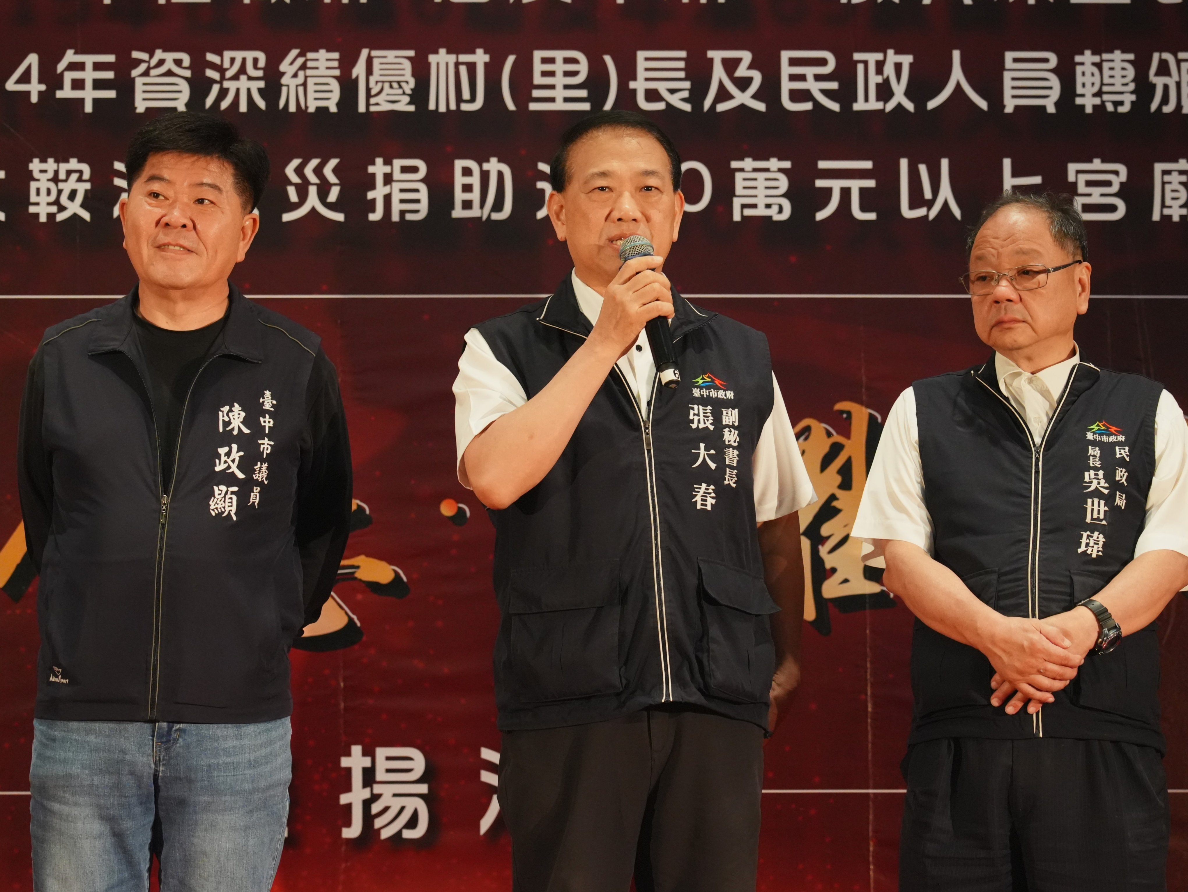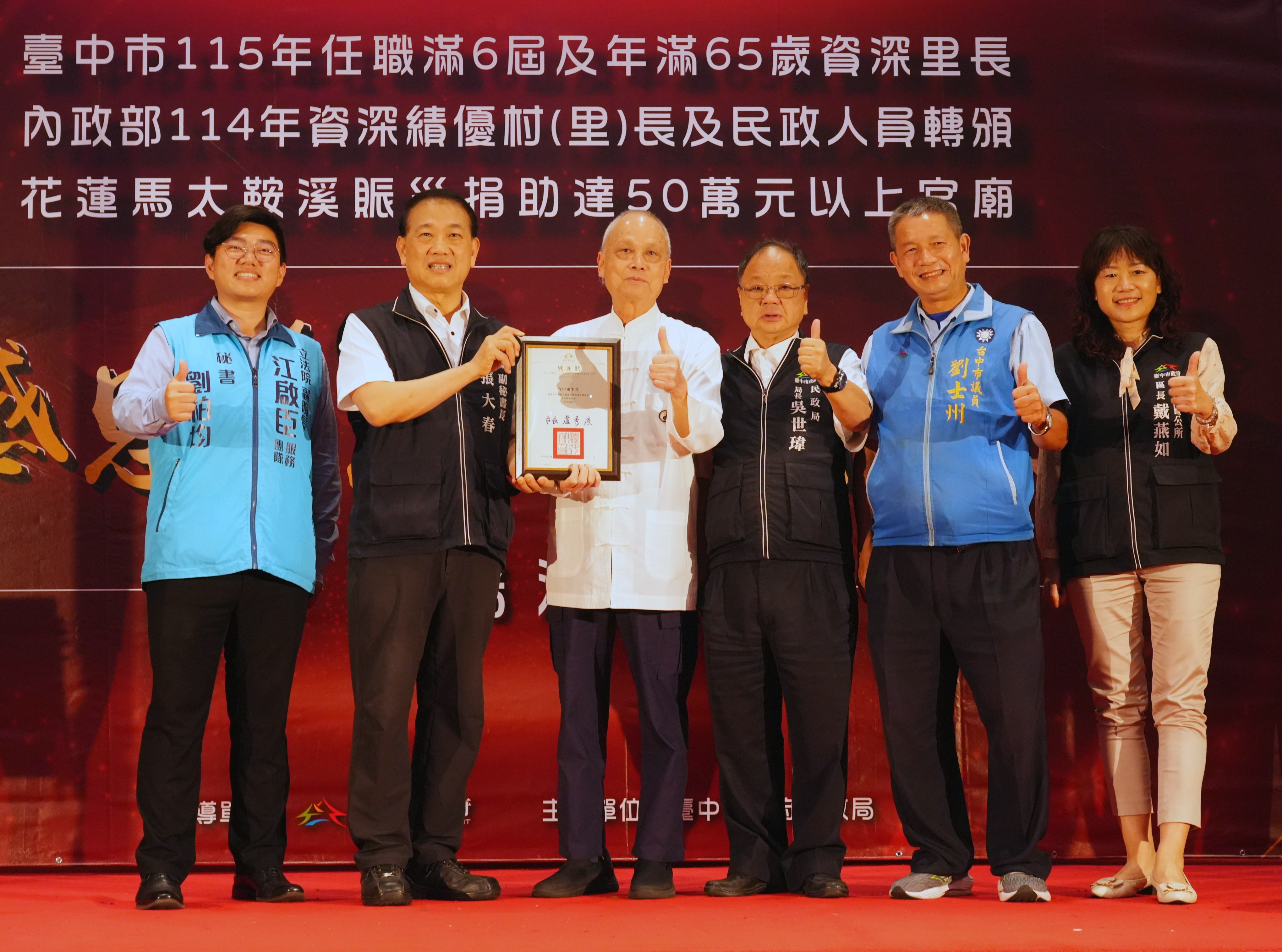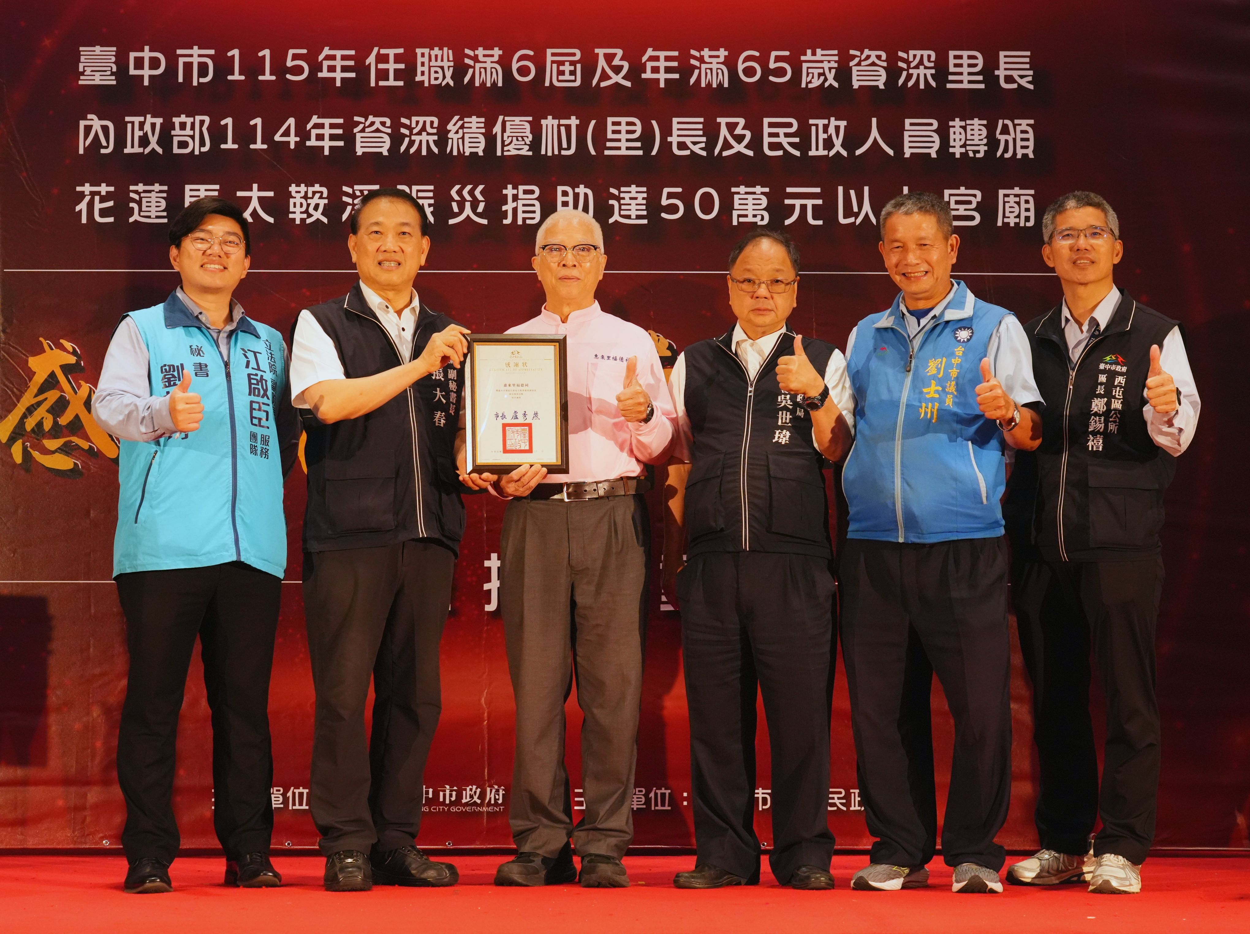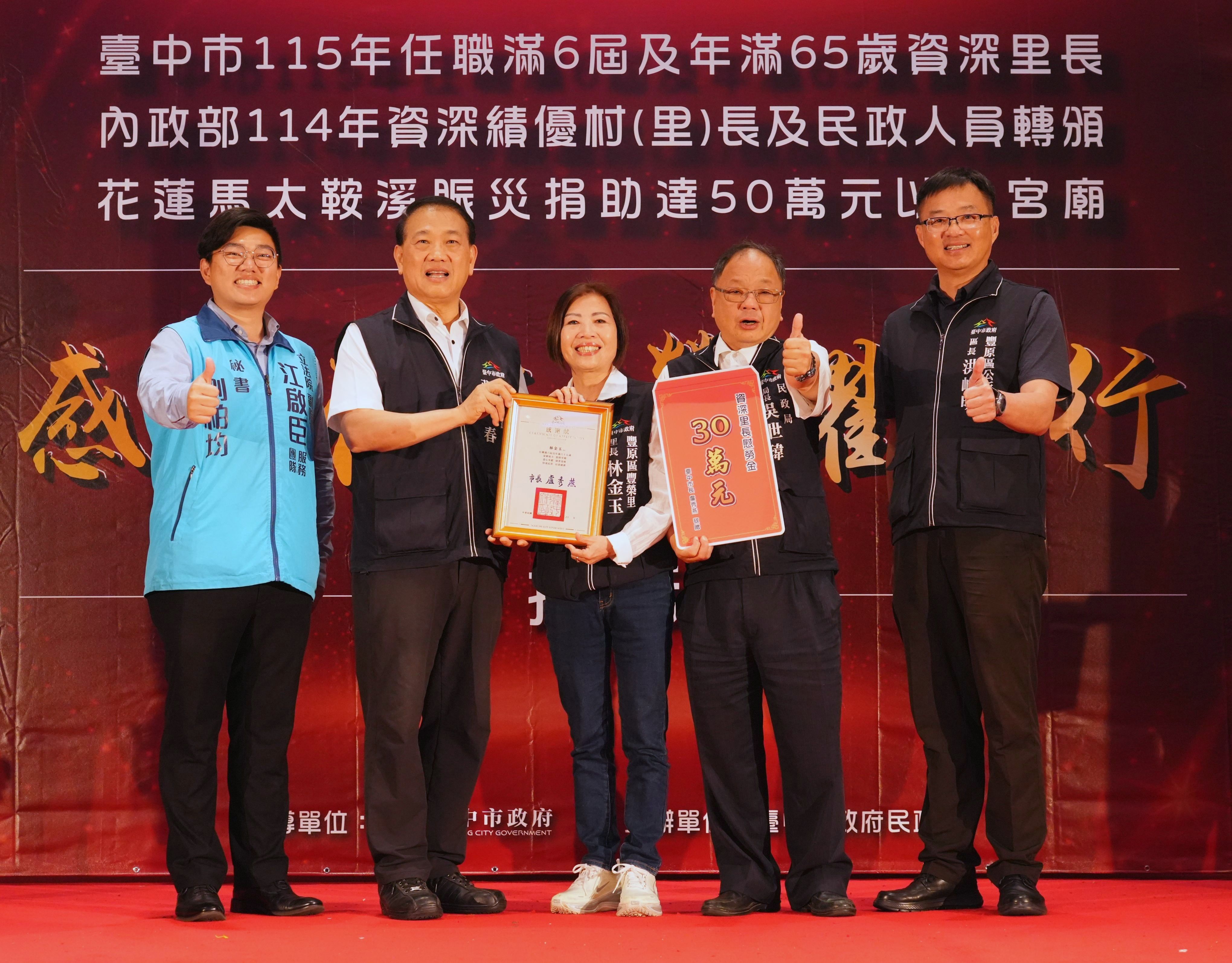 為感謝基層人員長年付出及宗教團體熱心公益,台中市政府民政局昨(25)日晚間舉辦「感恩有您,榮耀同行」表揚活動,表彰全市48位任職滿6屆且年滿65歲的資深里長,以及捐助花蓮馬太鞍溪賑災善款逾50萬元的7間宮廟代表,並轉頒內政部114年資深績優村(里)長及民政人員獎項。副秘書長張大春代表市長盧秀燕出席,肯定基層深耕地方、協助市政推動,也感謝宗教團體以實際行動回饋社會,傳遞溫暖善意。