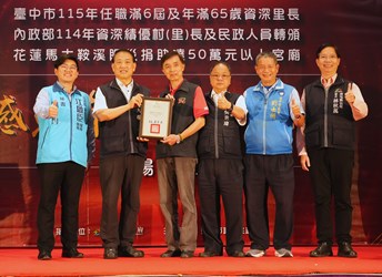 張副秘書長表示,里長是市府與市民之間最重要的橋梁,也是地方最即時、最溫暖的依靠,無論是社區建設、弱勢關懷、政策推動,或災害發生時的第一時間應變,里長總是站在第一線,協助市府穩定地方、照顧市民。尤其任職滿6屆且年滿65歲的資深里長,更代表20多年來不間斷的投入與奉獻,不僅見證地方成長,更以數十年如一日的堅守,成為推動台中持續向前的重要力量。