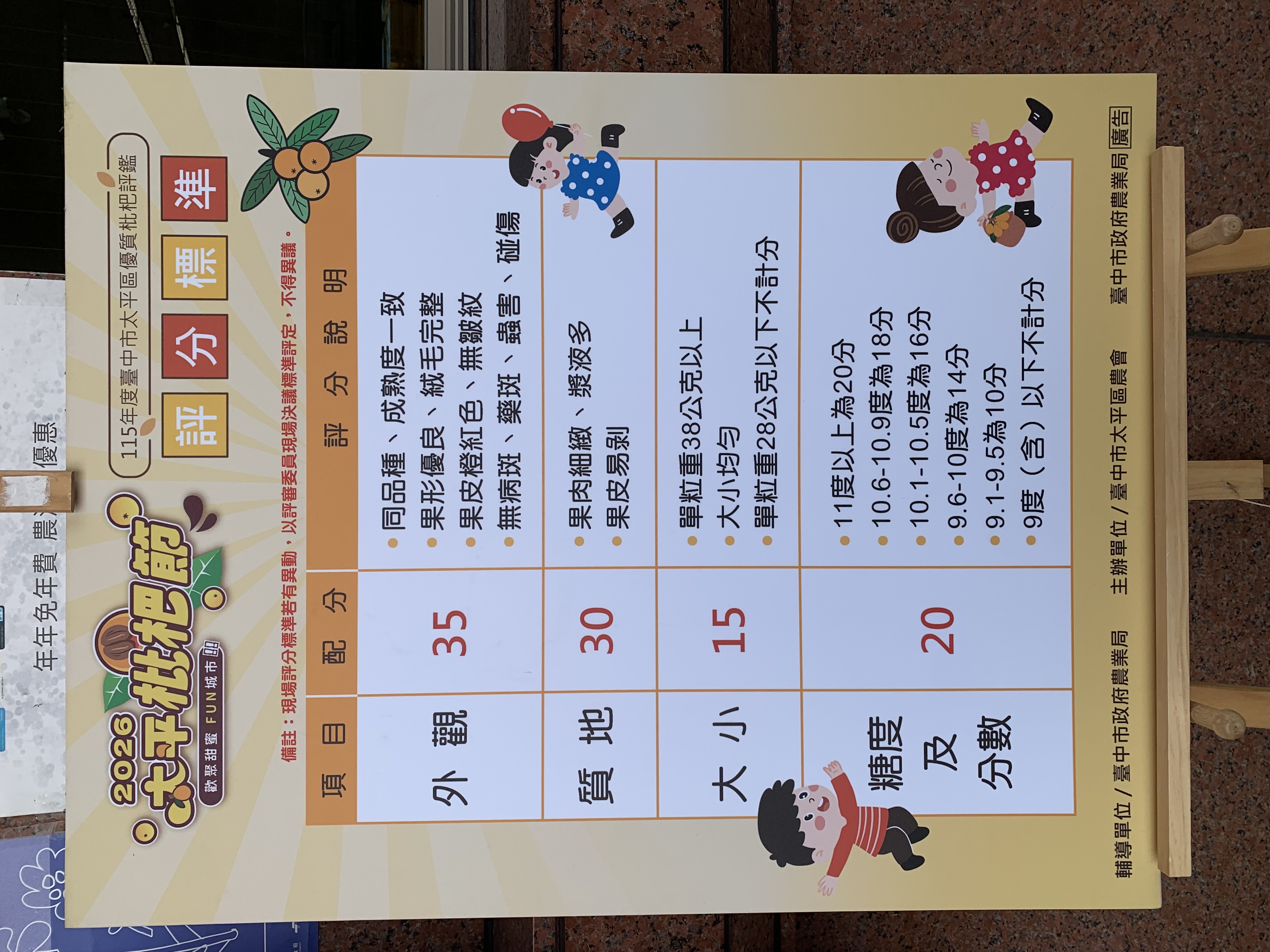 農業局表示,此次評鑑邀請農業部農糧署中區分署及台中區農業改良場等專家擔任評審,從果形與絨毛完整度、果皮色澤、有無病蟲害、口感風味、果肉細緻度、糖度及果粒大小等多項指標進行綜合評分。除冠軍外,第二名由張國隆、黃實全、黃大瑋及黃大川獲得,第三名則由陸進通、黃濬昶、張清標、陸清潭、黃玲紅及江明智等人獲獎,展現整體參賽品質水準。