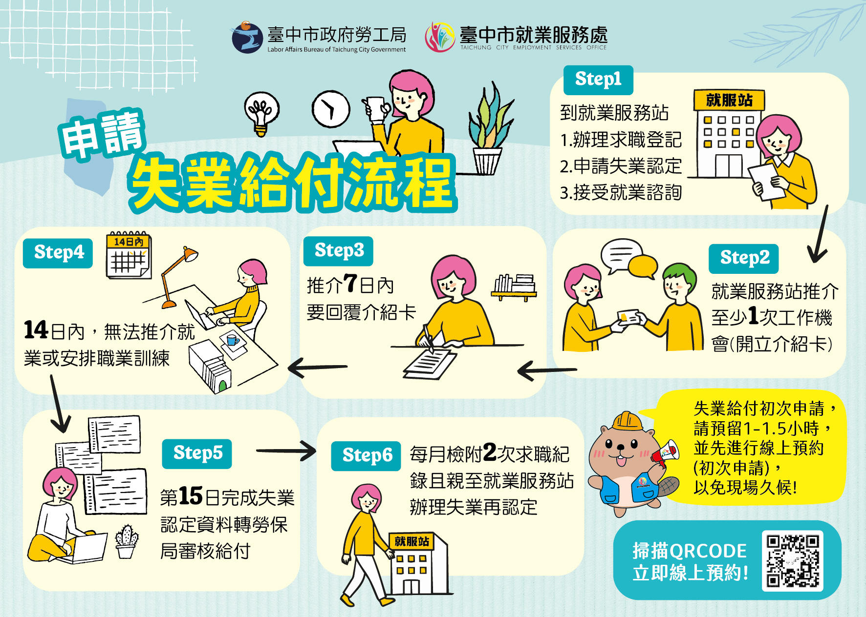 凡符合失業給付申請資格者,可攜帶國民身分證或其他身分證明文件影本、離職證明書或定期契約證明文件、被保險人金融機構存摺影本及失業(再)認定、失業給付申請書及給付收據等文件,向中市台中、豐原及沙鹿三大就業服務站辦理求職登記,另初次申請失業給付亦可透過台中市就業服務處官網(https://gov.tw/4JQ)預約申辦,歡迎符合資格的市民朋友可多加利用。