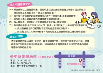 中市就業服務處補充,有關失業給付申請條件,凡就業保險之被保險人於非自願離職辦理退保當日前3年內,保險年資合計滿1年以上,具有工作能力及繼續工作意願,向公立就業服務機構辦理求職登記,自求職登記之日起14日內仍無法推介就業或安排職業訓練,得請領失業給付。