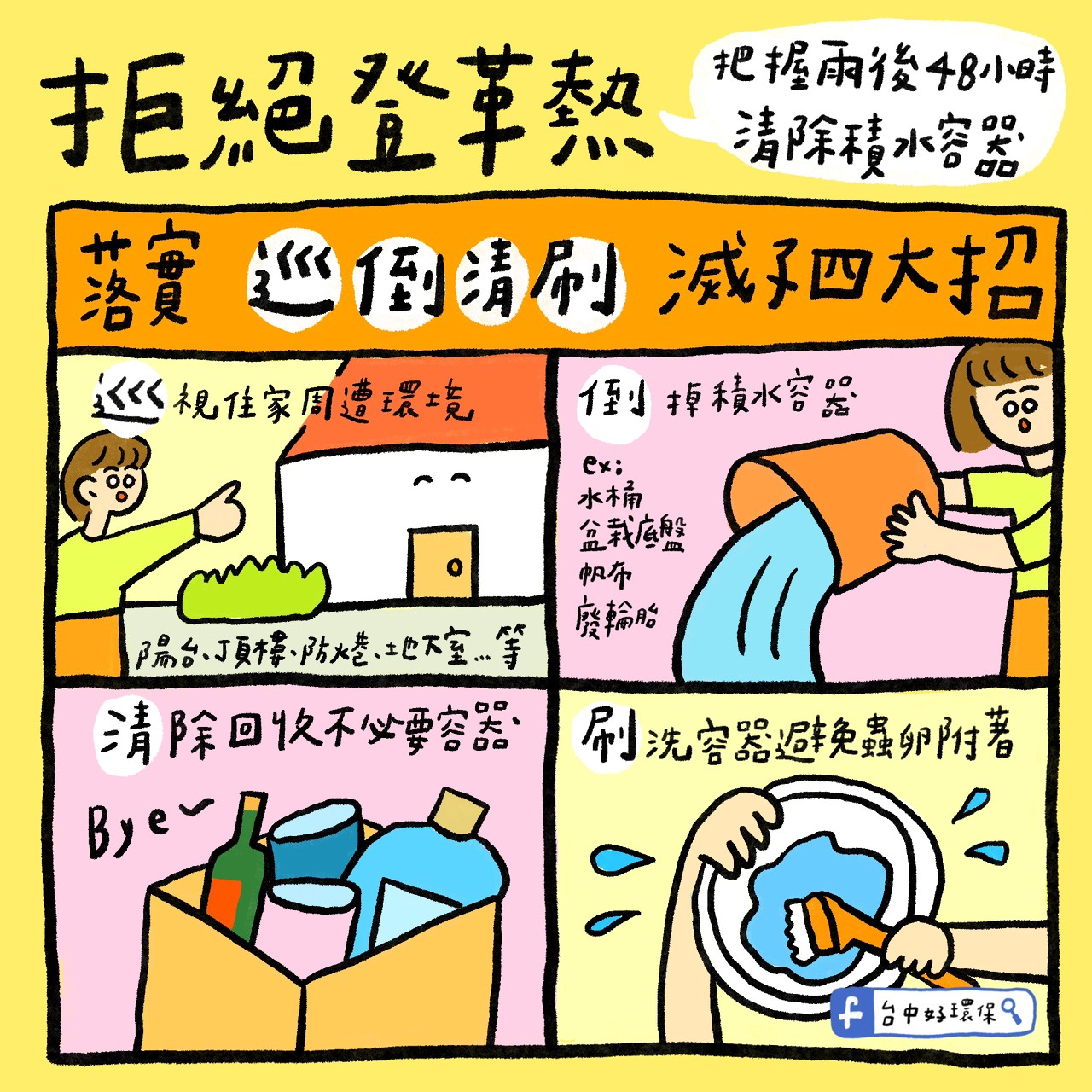 環保局說明,近兩年透過評比機制,針對各區公所及清潔隊在防治作為、衛教宣導及病例控制等面向進行量化評核,同時推動每週六「清淨家園日」,並強調雨後48小時內清除積水容器的關鍵時機,全面提升防疫量能。