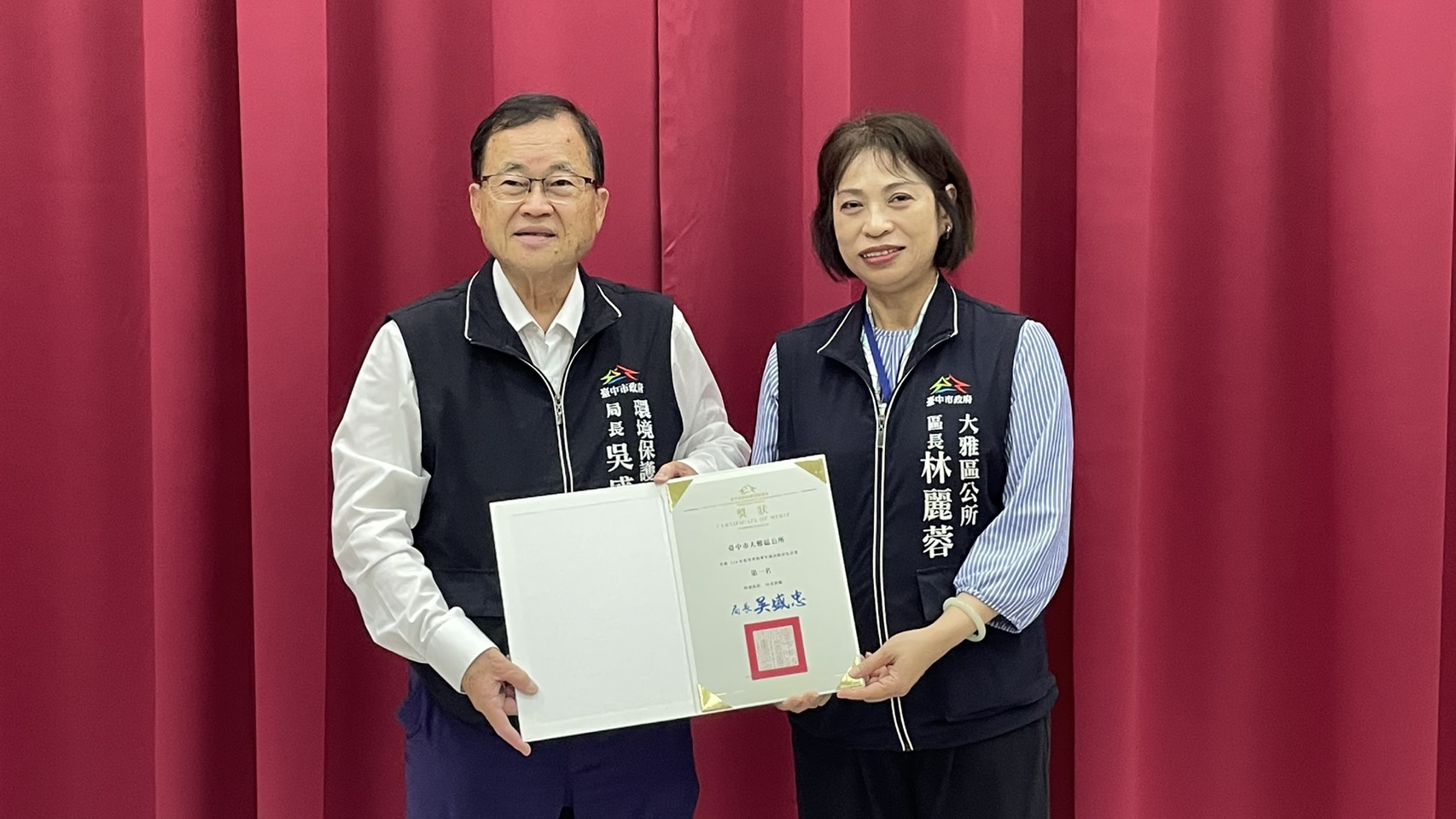 環保局表示,114年度評比分為區公所組及區清潔隊組。區公所組由大雅區公所榮獲第1名,展現強大基層動員力,每月各里均辦理至少1次孳生源清除作業,並透過多元管道加強防治宣導;第2名為南區區公所,第3名為清水區公所。區清潔隊組則由中西區清潔隊奪冠,全年辦理690場次防治宣導,並結合垃圾收運加強民眾衛教,第2名為梧棲區清潔隊,第3名為后里區清潔隊。