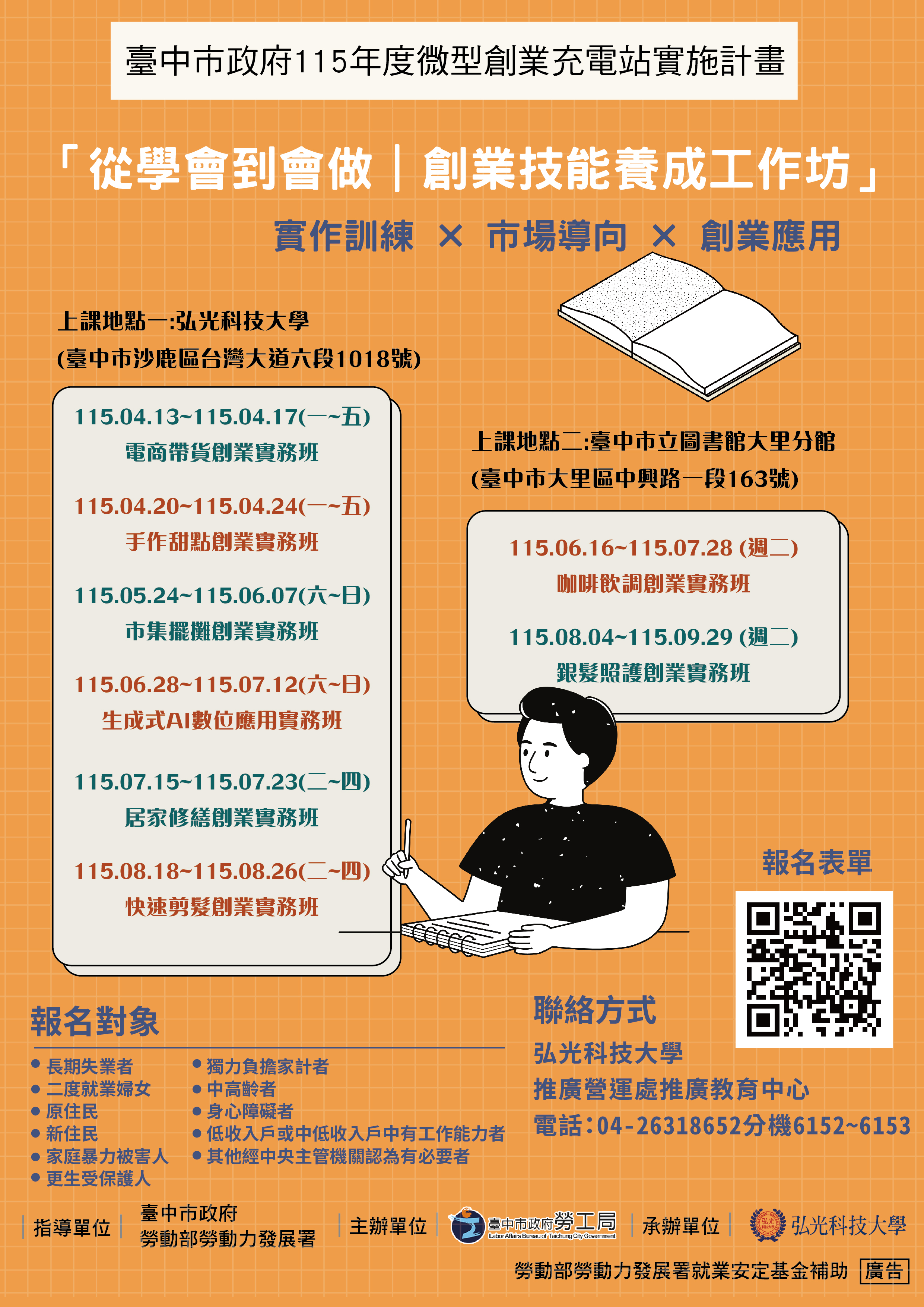 勞工局表示,歡迎有創業規劃或正在創業的市民把握機會參與相關課程與輔導服務,115年度活動資訊可至勞工局官網查詢(https://www.labor.taichung.gov.tw/1229008/1229015/1247865/1303755/1303769/1303770/post),或電洽04-22289111轉35616洽詢。(4/8*4)*勞工局