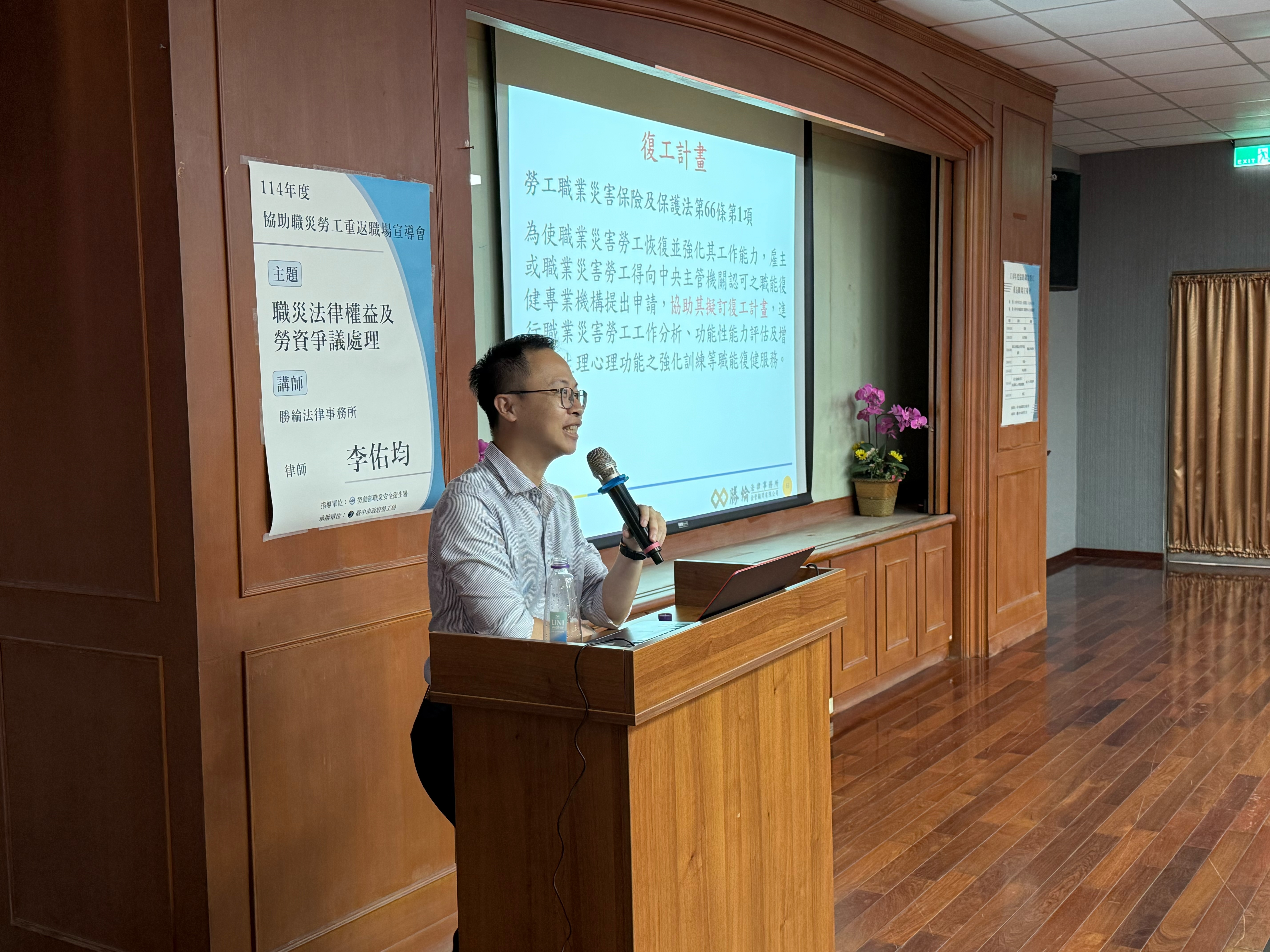 勞工局說明,宣導會課程內容兼顧制度說明與實務分享,上午場次以「掌握資源、經濟支持不中斷」為主軸,介紹協助職業災害勞工重返職場補助辦法的申請流程以及勞工保險局專業解析職災保險給付制度,協助事業單位與勞工了解相關資源並加以運用。下午場次則以「權益保障、專業指引更安心」為主題,邀請執業律師說明相關法律權益,提供專業法律觀點,並由職能復健專責機構分享復健服務與成功案例,協助職災勞工了解復健方向並增強重返職場的信心。