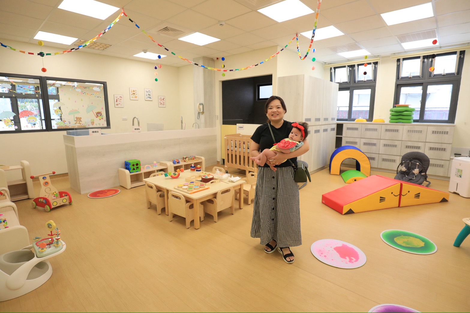 盧市長說明,南區兒少家庭福利館一樓公托收托0至2歲幼兒,家長自付額1,500元,換算每天僅50元,為六都最便宜;照顧比為1:4,優於中央規定的1:5,為全國最好。二樓親子館服務0至6歲幼兒,提供冷氣空間、遊戲設施、說故事課程,並首創免費玩具出借服務,使用後消毒再循環利用,提供安全、溫馨且專業的照顧環境。