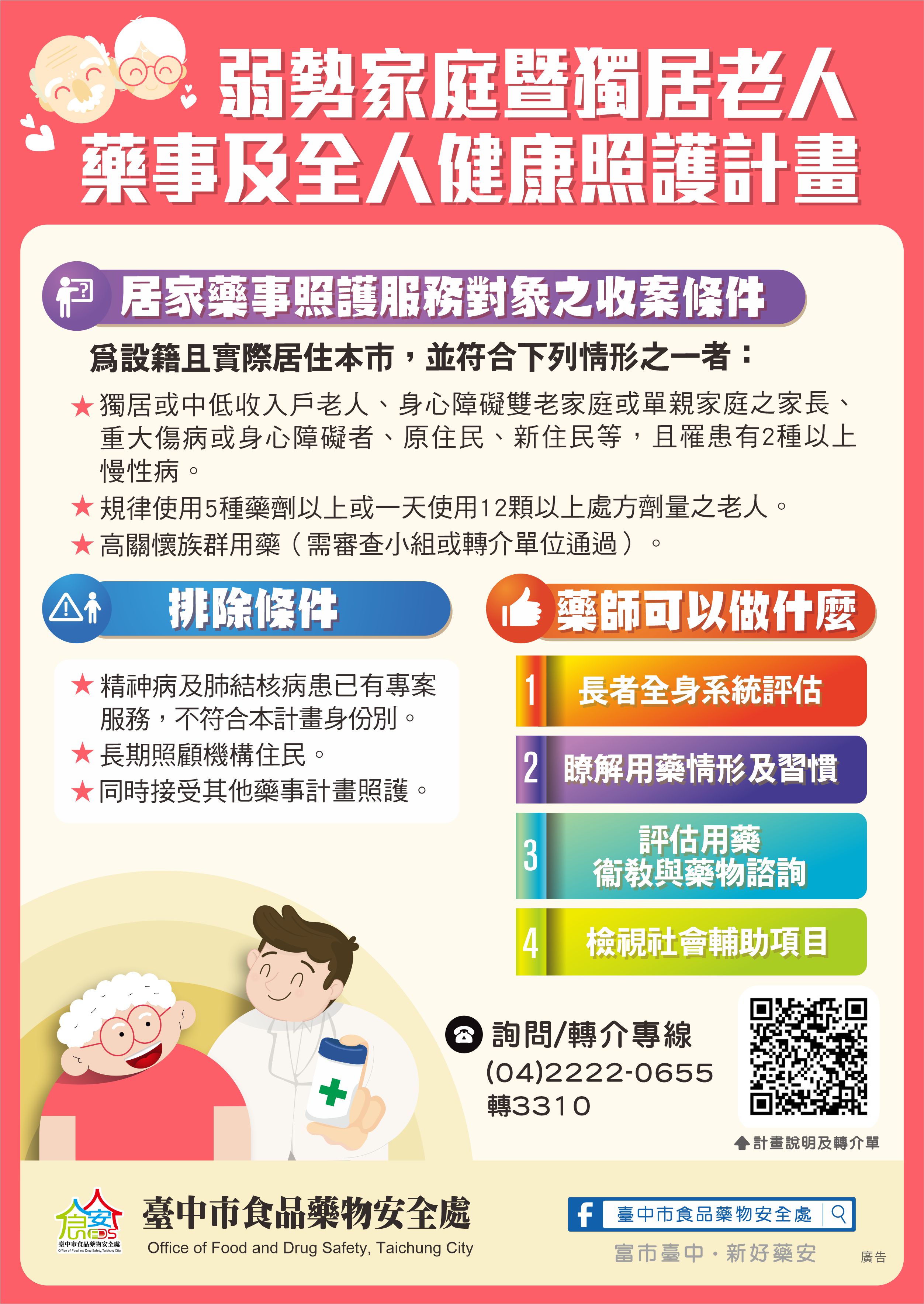 食安處強調,影響藥物治療成效的關鍵往往在於個案的「健康識能」與「服藥遵從性」。因此,台中市採社區與居家雙管齊下,致力於建立市民正確的用藥觀念,透過關懷與衛教改善民眾生活型態。115年度計畫持續擴大招募中,服務對象涵蓋長者、弱勢家庭及居家安寧療護個案,熱烈歡迎具備服務熱忱的藥師(生)踴躍投入,一同提升台中市的藥事照護量能。計畫相關資訊可至食品藥物安全處官網查詢(首頁>業務專區>藥品與醫療器材專區>藥事照護計畫),或洽詢專線04-22220655,將有專人提供服務。