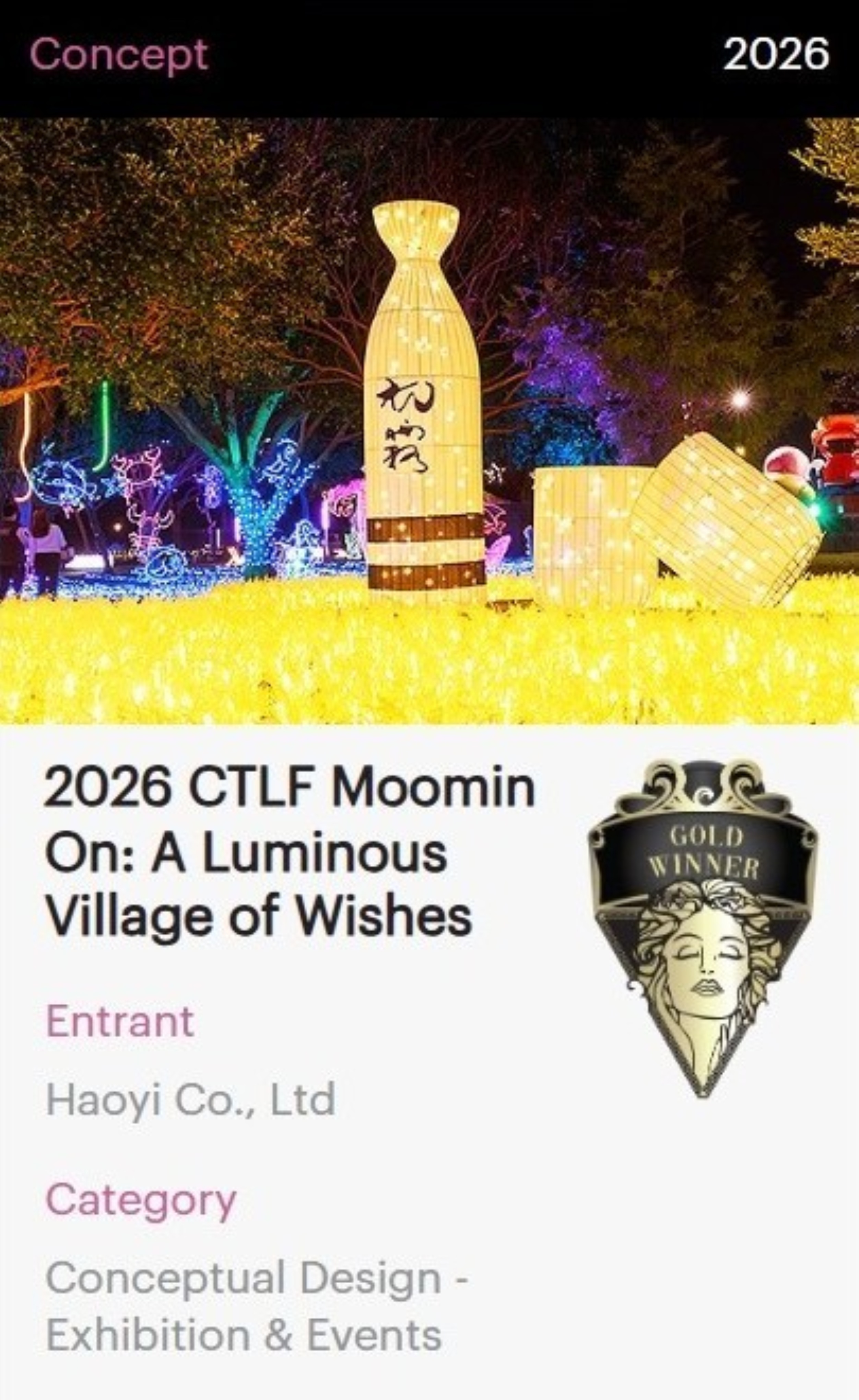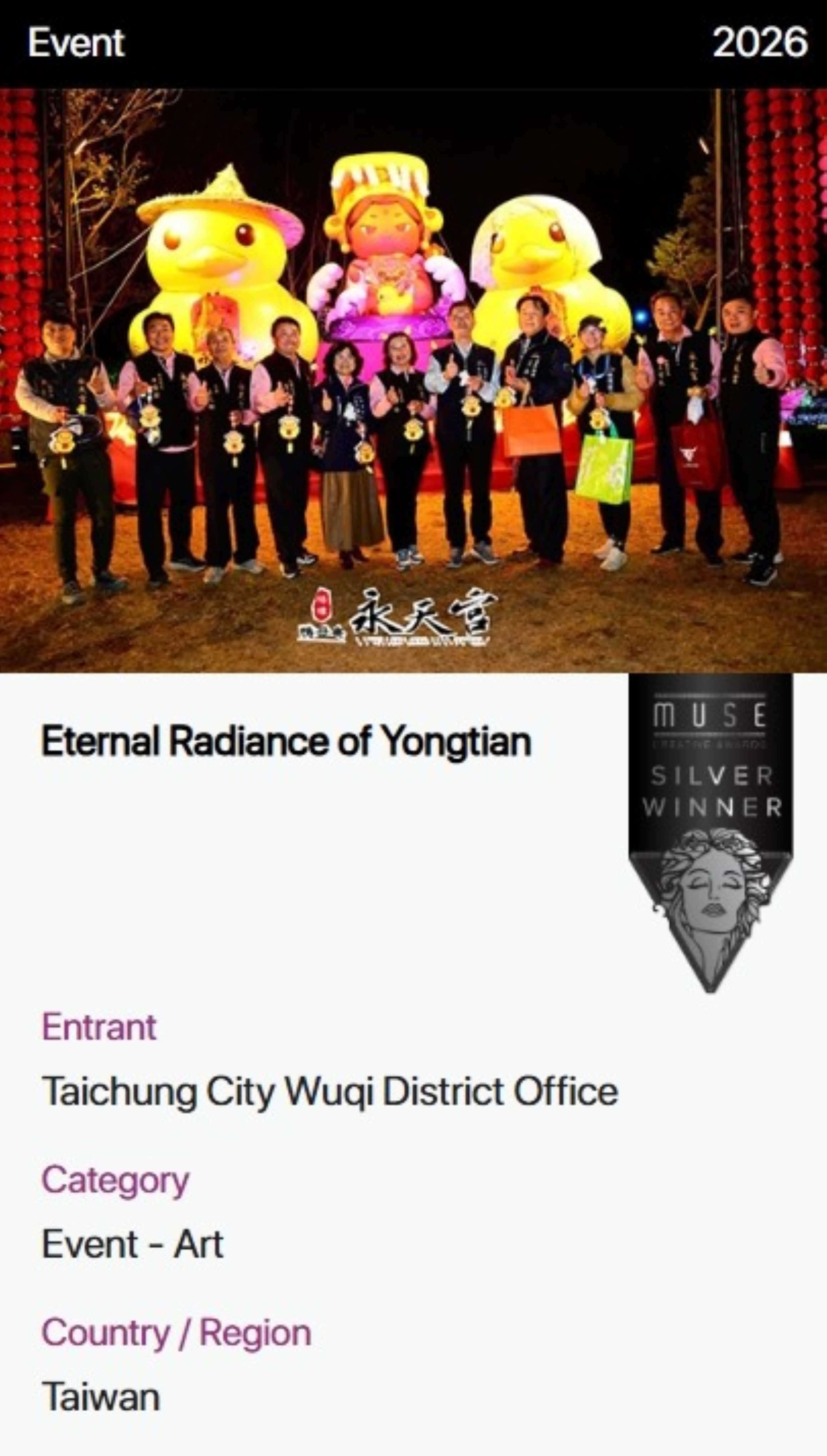 2026中台灣燈會再傳國際獲獎捷報!由台中市政府民政局打造的「幸福祈願村」燈區,融合傳統信仰、地方文化與當代美學,以創新策展理念勇奪2026美國謬思設計及創意大獎5項殊榮,一舉拿下2金3銀佳績。民政局長吳世瑋表示,此次獲獎不僅是對市府團隊與在地參與單位的高度肯定,更彰顯台中深厚的文化底蘊與亮眼的設計實力,讓世界看見台中作為文化創意城市的獨特魅力。