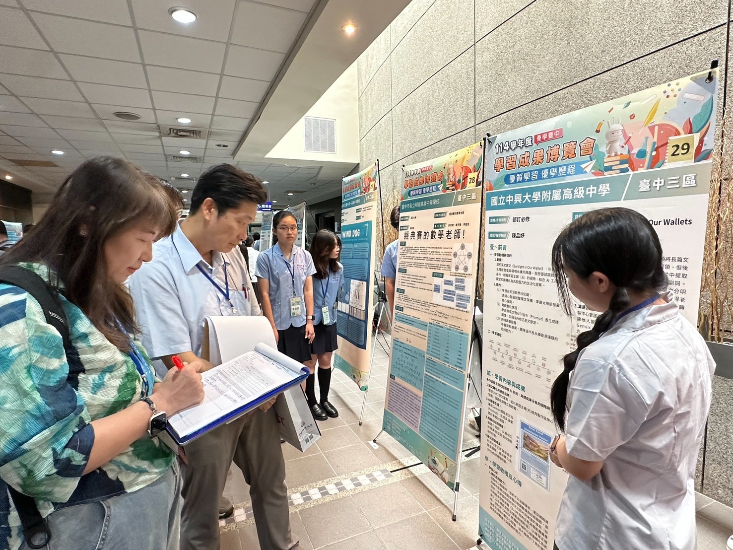 今日博覽會吸引來自中三區20所高中職校、共計182位師生踴躍參與,現場展出45件優質作品。學生透過動態短講與靜態海報,生動呈現自主學習的豐沛能量,展現出卓越的表達力、團隊合作及跨領域整合實力。