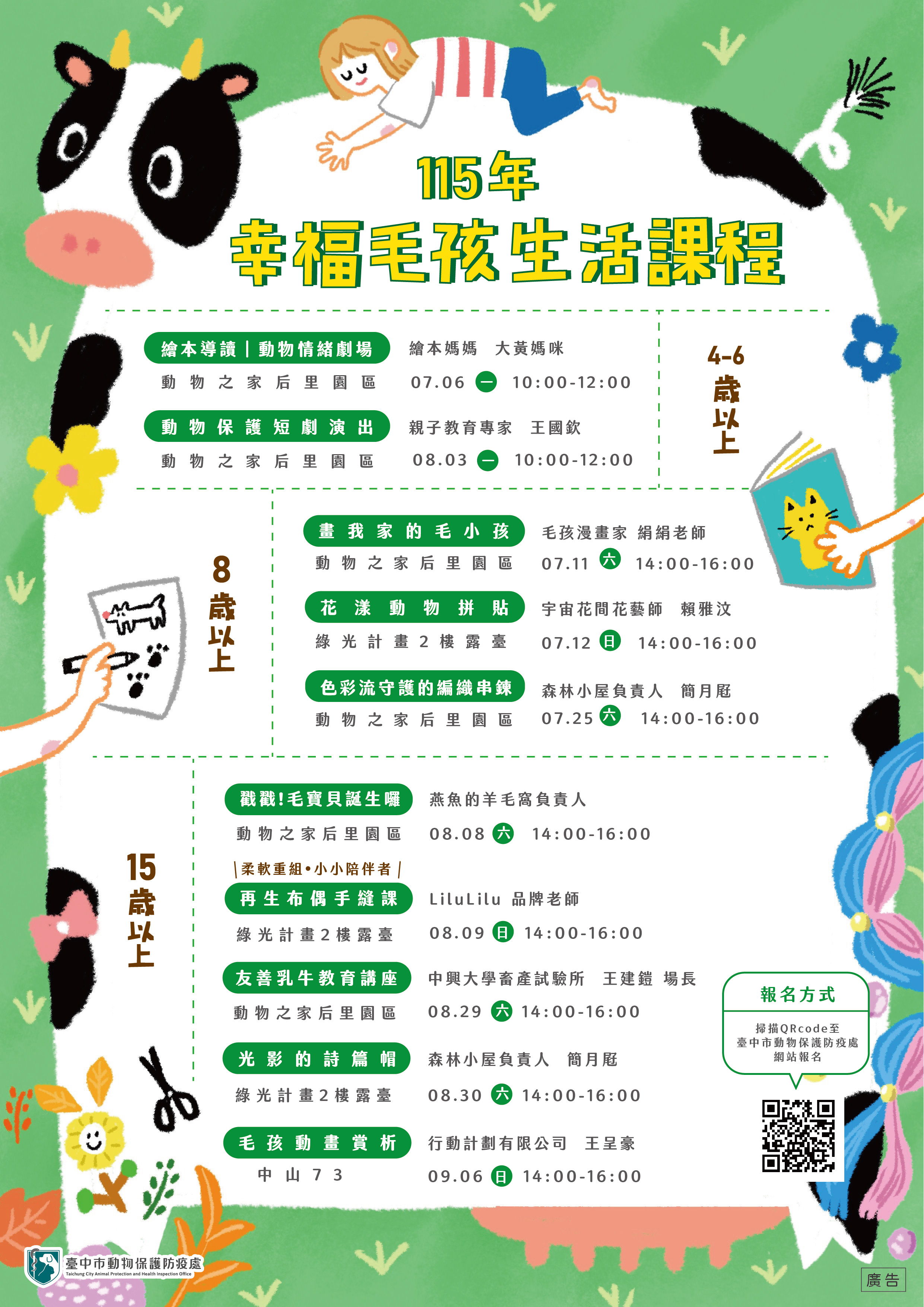 台中市動物保護防疫處表示,在現代社會中,人與動物的關係日益緊密,無論是陪伴在日常生活中的寵物、提供人類所需的經濟動物,或與人類共存的野生動物,如何以友善且永續的方式與其共處,已然成為當代社會的重要顯學。為此,年度課程依不同年齡層設計,內容豐富多元,包含適合親子共同參與的繪本導讀與動物情緒劇場、動物保護短劇演出等,還有適合大朋友參與的繪製自家的毛小孩、動物拼貼藝術、編織串鍊、羊毛氈手作及再生布偶縫製等,透過實際動手創作,深化人與動物之間的情感連結。