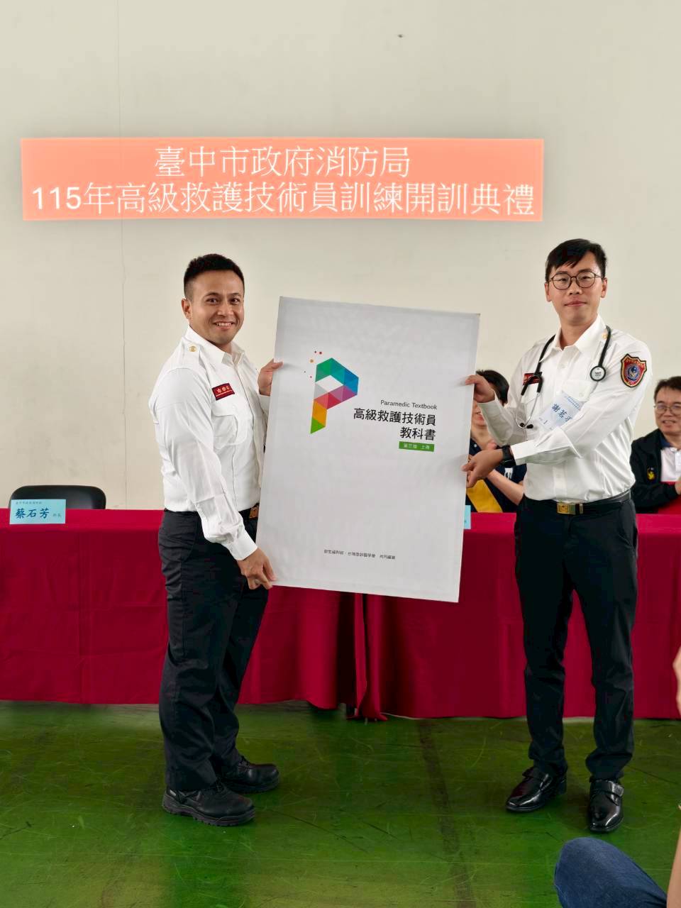 市府消防局表示,開訓典禮中特別安排了深具意義的傳承儀式。由林簡任技正與114年(TP7)高級救護技術員學員長,分別將象徵拯救生命重責大任的「聽診器」,以及代表專業知識傳承的「EMT-P教科書」,授予本期訓練學員代表。此舉不僅象徵責任的承擔與專業精神的延續,隨後更由犁份分隊謝茗羽擔任本屆學員代表,請全體參訓學員起立,共同朗讀EMT-P教科書首頁的誓詞進行莊嚴宣誓,齊心展現投入救護專業與守護生命的堅定決心。