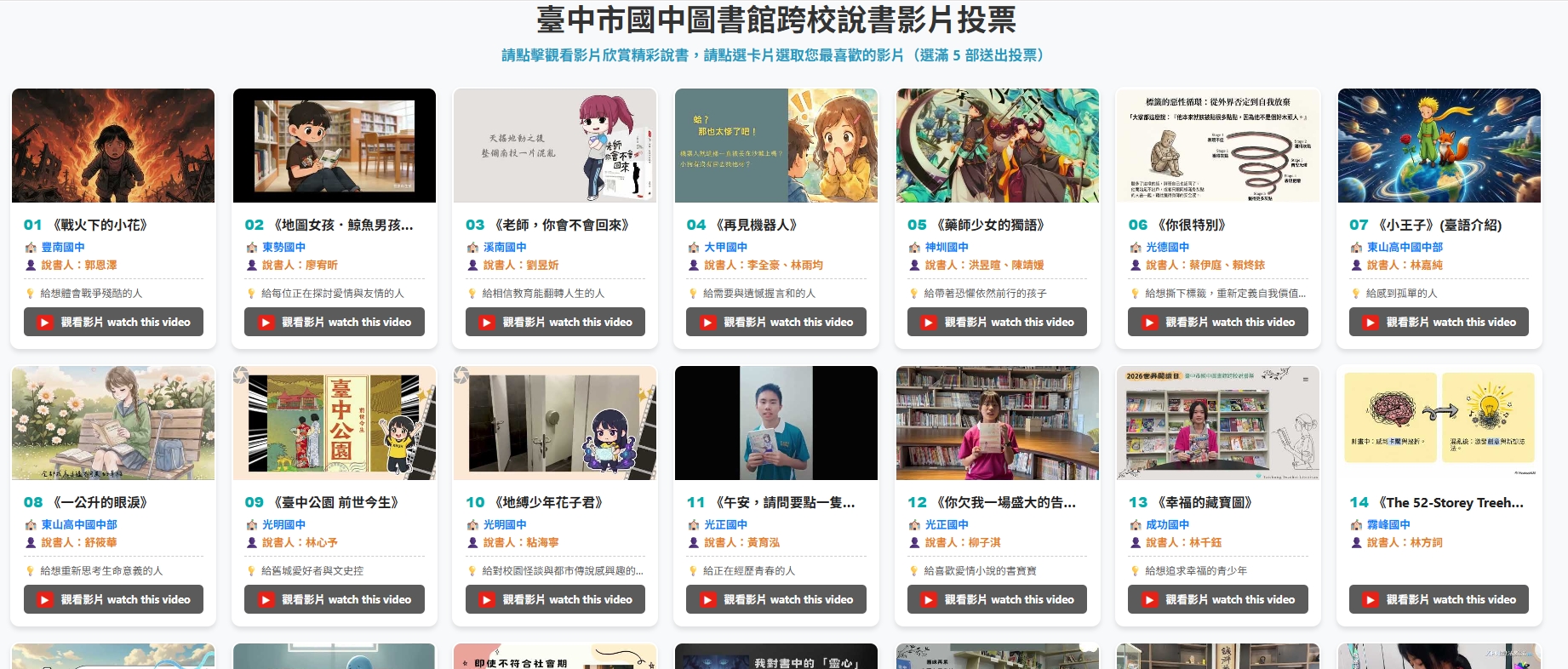 教育局表示,今年由「閱讀教育輔導團」串聯各校推動跨校閱讀,國小組以「閱遊心海,韌性啟航」為主題,精選百本貼近兒童生活的繪本與知識讀物,透過共讀活動培養學生自我覺察、人際互動及決策能力;國中組則推出「書聲連線,閱動台中——跨校說書祭」,鼓勵學生錄製1至2分鐘書籍推薦短片並上傳平台,4月底將展開人氣競賽,結合閱讀與數位表達,提升媒體素養與表達能力。