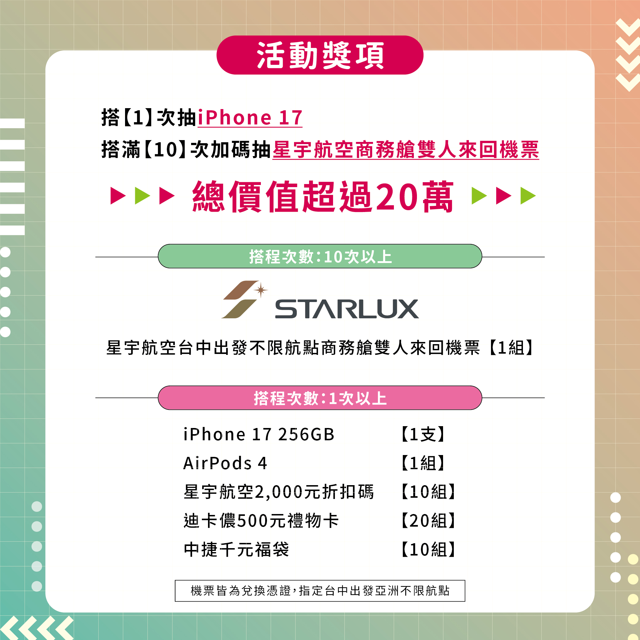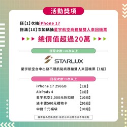 台中捷運公司總經理朱來順表示,5年來每一位旅客的搭乘都是中捷持續前進的重要力量。首波感恩抽獎活動將自4月25日至5月31日登場,凡加入中捷APP會員並綁定電子票證卡號,搭乘1次即可參加抽獎,獎項包含iPhone 17、AirPods 4、迪卡儂禮物卡、星宇航空折扣碼及中捷限定福袋;累計搭乘滿10次,還有機會抽中商務艙雙人來回機票大獎。