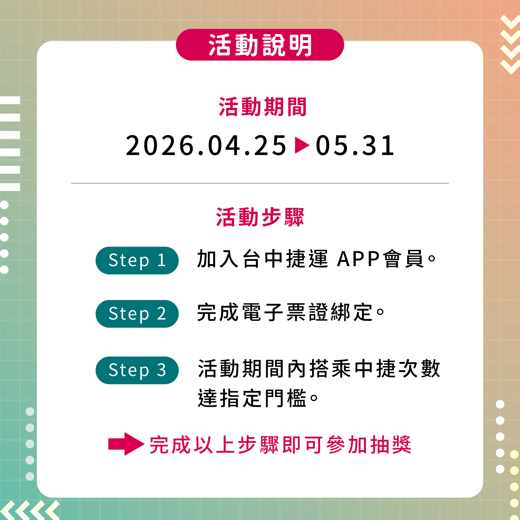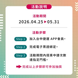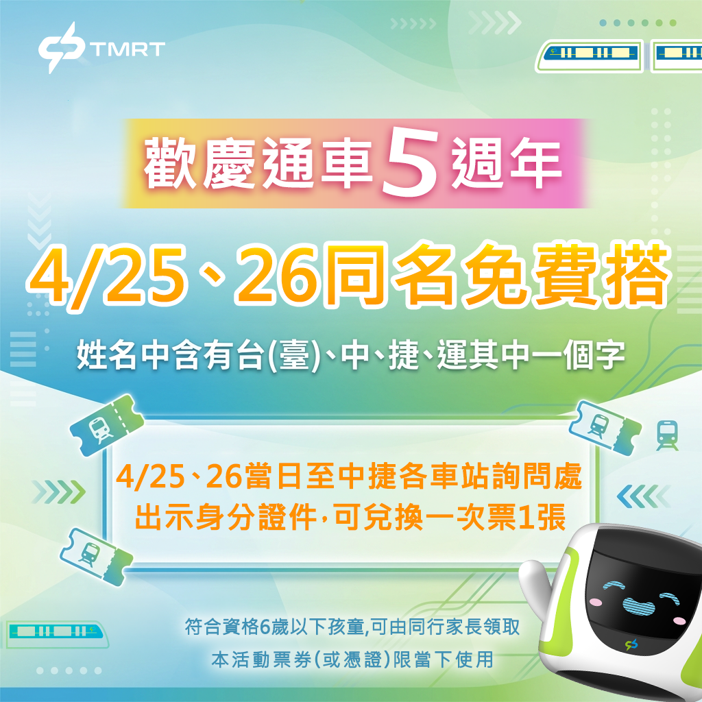 此外,4月25日及26日周末兩天,中捷特別推出「同名免費搭乘」活動,凡姓名中含「台(臺)、中、捷、運」任一字,持身分證件至各站詢問處即可兌換單程免費車票1張,享受搭乘優惠。
