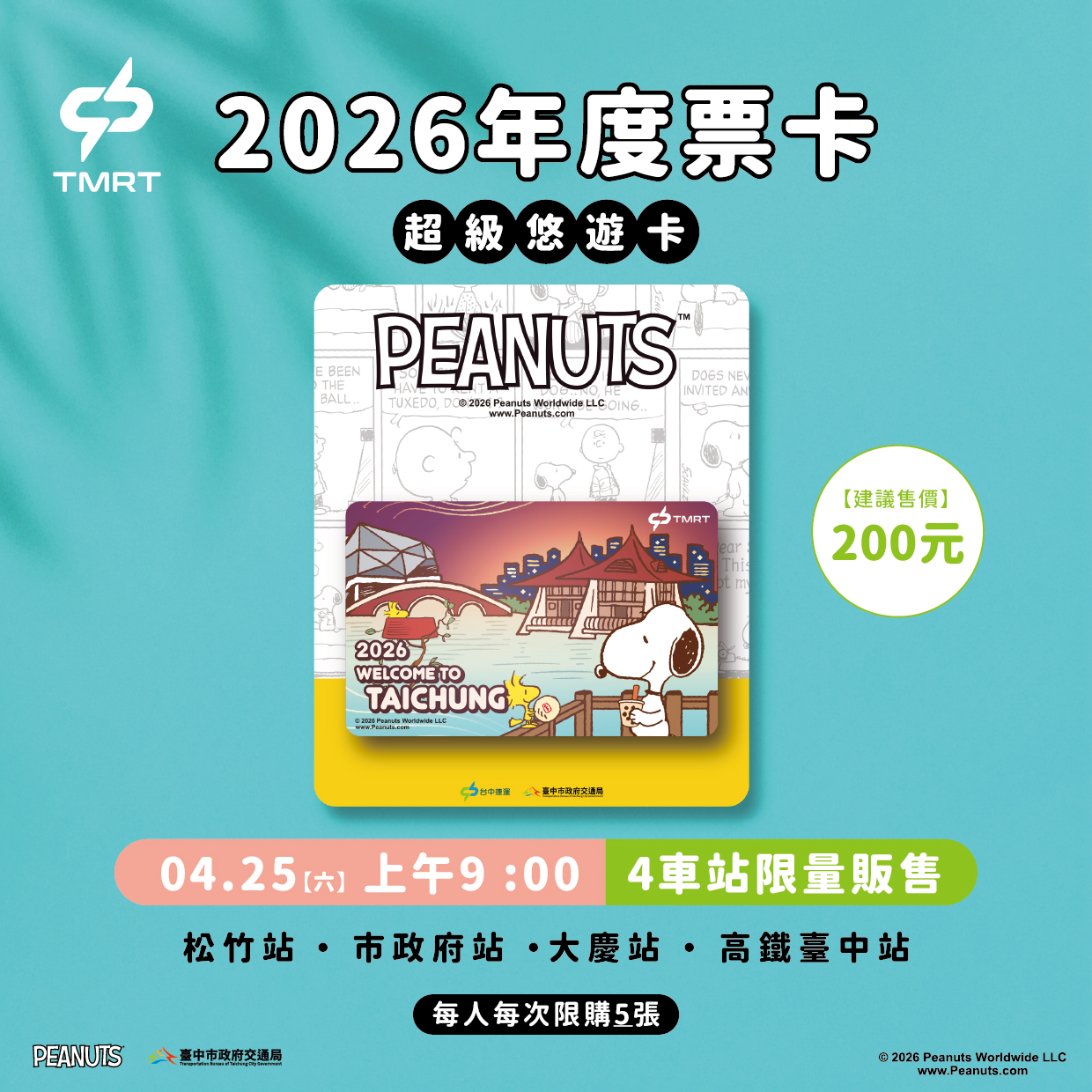 備受關注的2026年度紀念票卡,也將於4月25日上午9時起,在松竹、市政府、大慶及高鐵台中站等4站限量開賣。中捷指出,此次票卡結合史努比與Woodstock形象,融入珍珠奶茶與太陽餅等台中元素,並升級為超級悠遊卡,兼具收藏與實用價值。